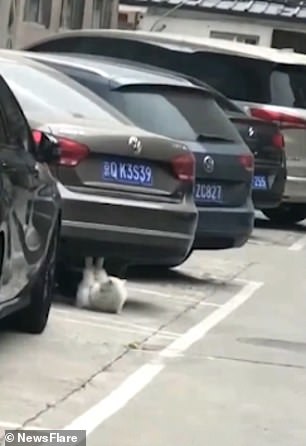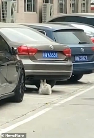 The fluffy white feline was filmed exercising in China and can be seen laying on the floor with its back legs on the grey vehicle.