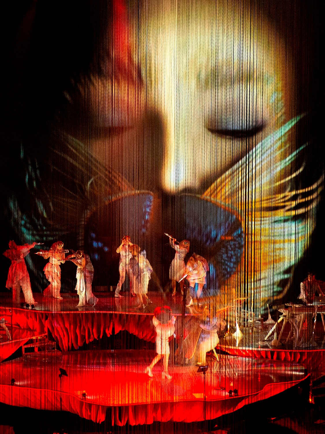 this vision was realised with 27 moving curtains that captured projections on different textures and LED screens, creating a digitally animated show : a “modern lanterna magica” for live music. i also wanted to feature bespoke instruments: a magnetic harp, an aluphone, a circular flute, and a reverb chamber, specially built with an audio architect to enhance the most intimate version of a performance—in a personal chapel.