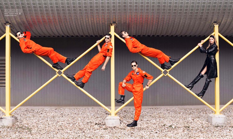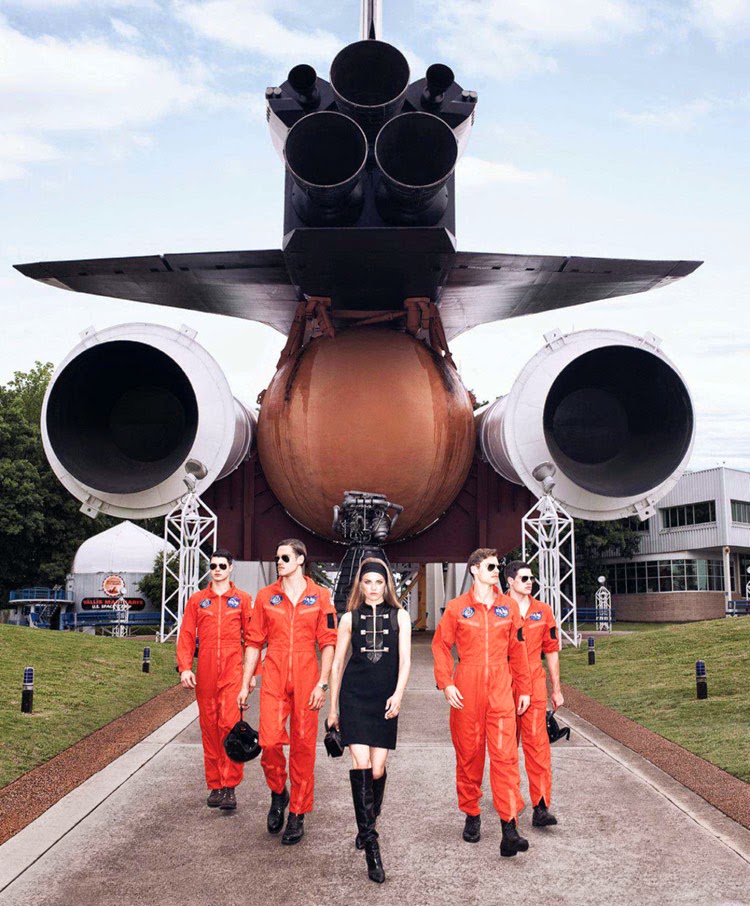 Space Camp-Photographed by Terry Richardson for the August issue of Harper’s Bazaar, models Vladimir Ivanov, Jordan Stenmark, Matt Fellman and Carson Starnes get ready to start a space mission. Outfitted by George Cortina with the traditional astronaut uniform, leather boots and aviator sunglasses, the models spend their last moments on Earth enjoying the presence of blonde model Anna Jagodzinska. Posing for traditional portraits before their fictional adventure, the models deliver their best angles and poses, showing their fearless attitude. / Hair by Harry Josh. Makeup by Frank B.” – The Fashionisto