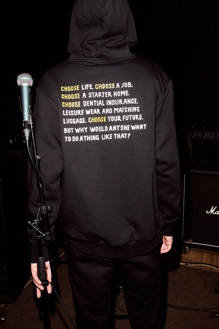 The collection is finishes with a picture of Renton and the slogan of the film Trainspotting “choose life”. Renton, as a kino symbol of the mid-90s, is a stylish, knowledgeable young guy who is an addict, still chooses “Life”. He sees how the culture is changing around, how music is changing, as a new stage of life and new perspectives come.