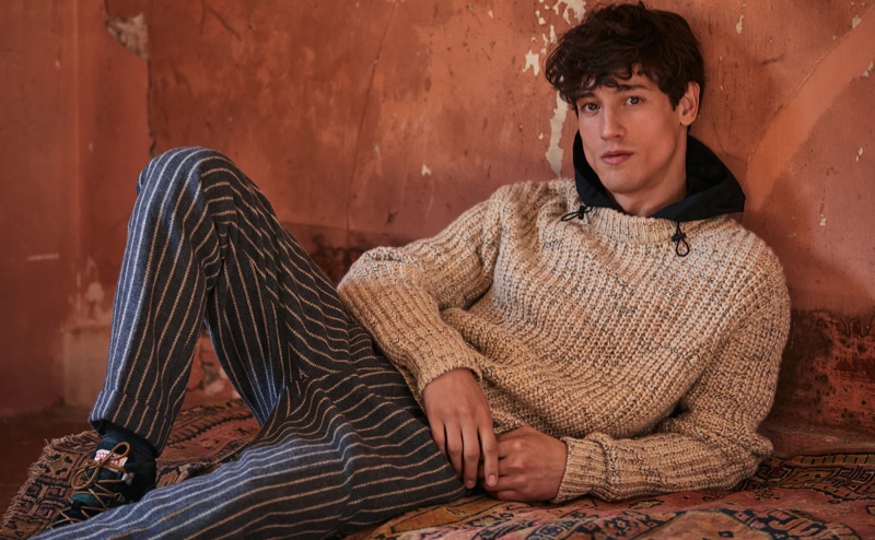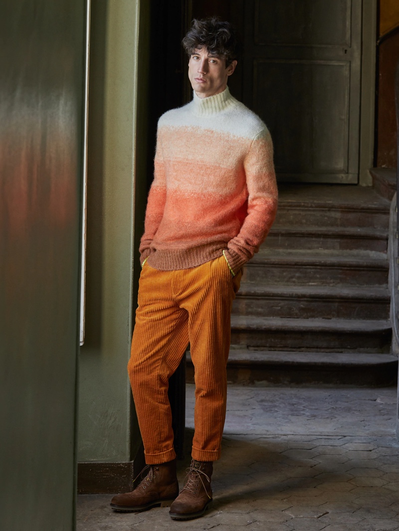 Fresh new styles take up the spotlight with a new fall editorial from Scotch & Soda. The brand connects with model Nicolas Ripoll once more to showcase must-have menswear. Scotch & Soda proposes color for the season with an orange ensemble that revolves around a gradient turtleneck sweater, and corduroy pants. Meanwhile, a rustic romanticism takes over with another look that features a textured hooded sweater and striped pants.” – TheFashionisto..com