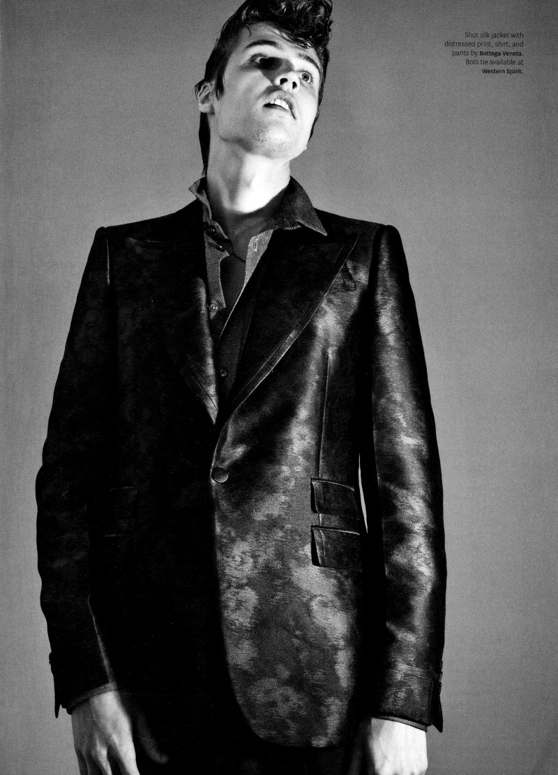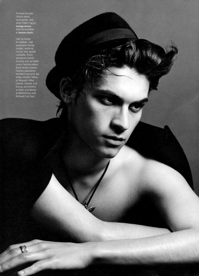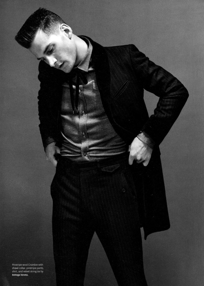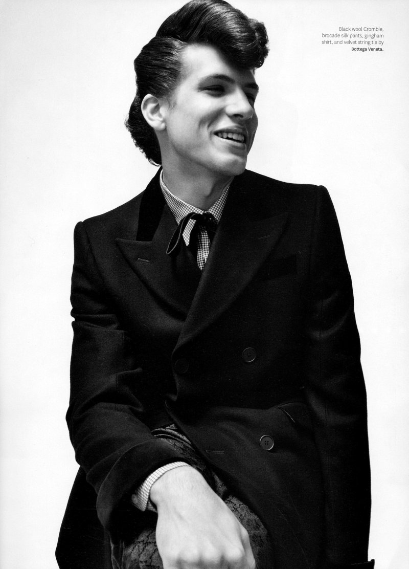 Out’s resident fashion editor Grant Woolhead teams up with Terry Tsiolis for the September issue to capture Bottega Veneta creative director Tomas Maier’s teddy boy. Shot in black and white, Charlie Westerberg, Mikus Lasmanis, Clinton Jorgenson, Erik Rocca, Miles Garber, Michael Osborn and Wilhelmina’s Adrian come together for a nostalgic throwback with modern implications. Courtesy of Thefashionisto.com