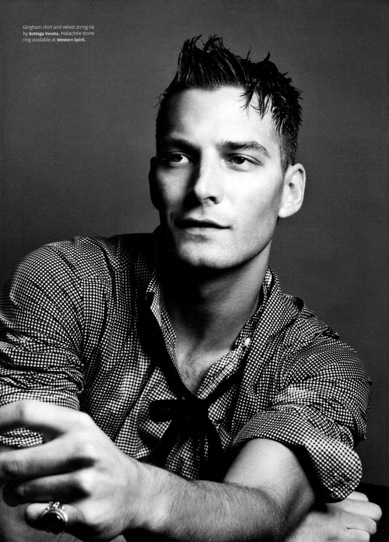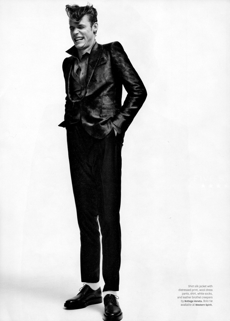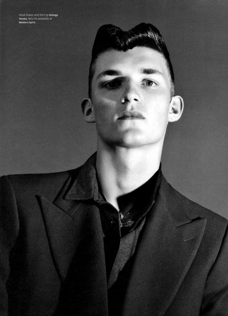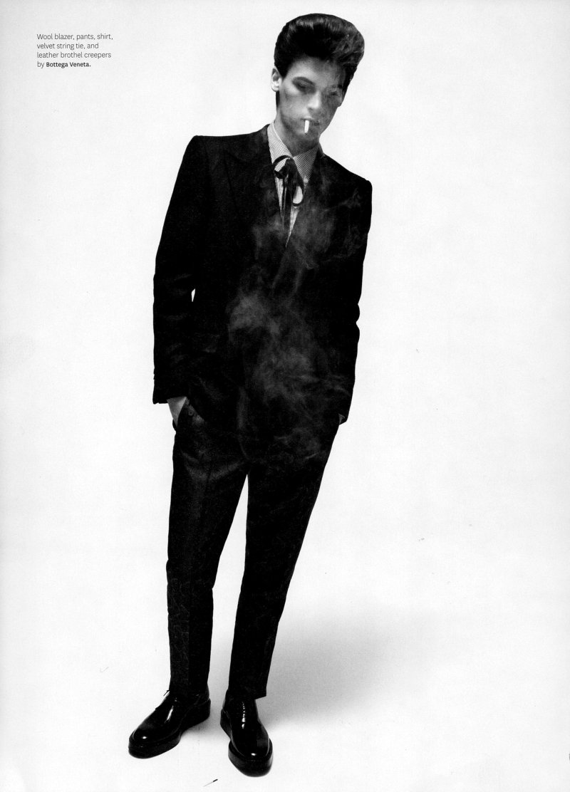 Out’s resident fashion editor Grant Woolhead teams up with Terry Tsiolis for the September issue to capture Bottega Veneta creative director Tomas Maier’s teddy boy. Shot in black and white, Charlie Westerberg, Mikus Lasmanis, Clinton Jorgenson, Erik Rocca, Miles Garber, Michael Osborn and Wilhelmina’s Adrian come together for a nostalgic throwback with modern implications. Courtesy of Thefashionisto.com