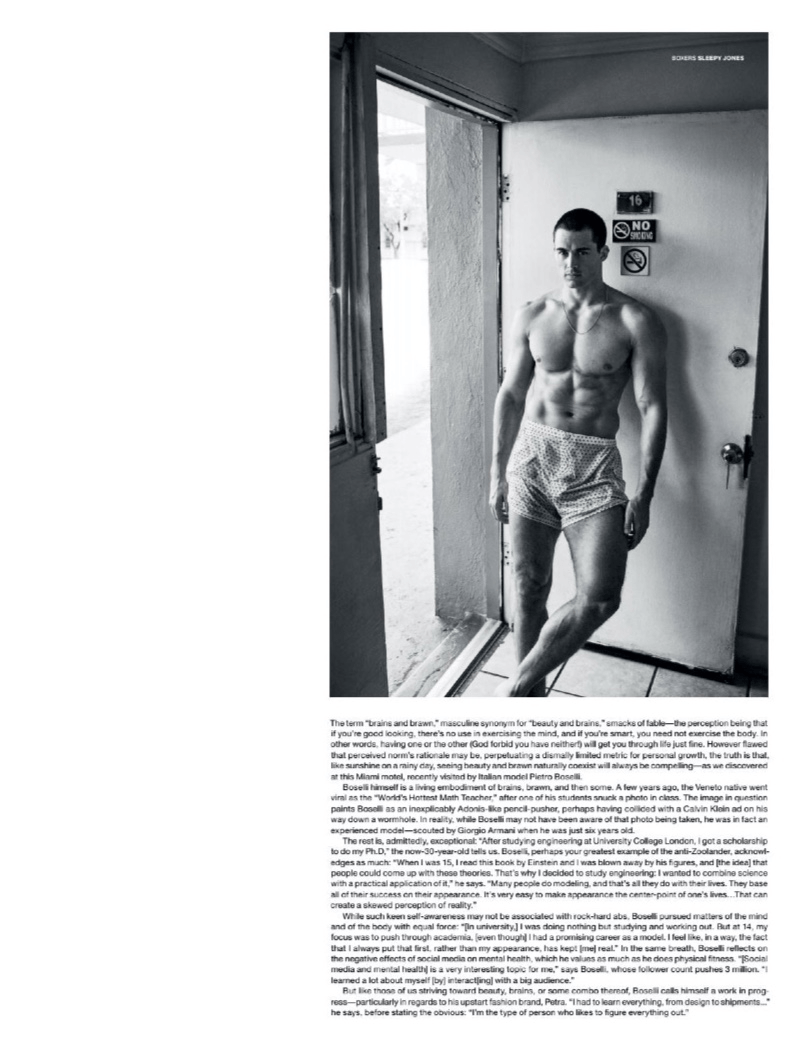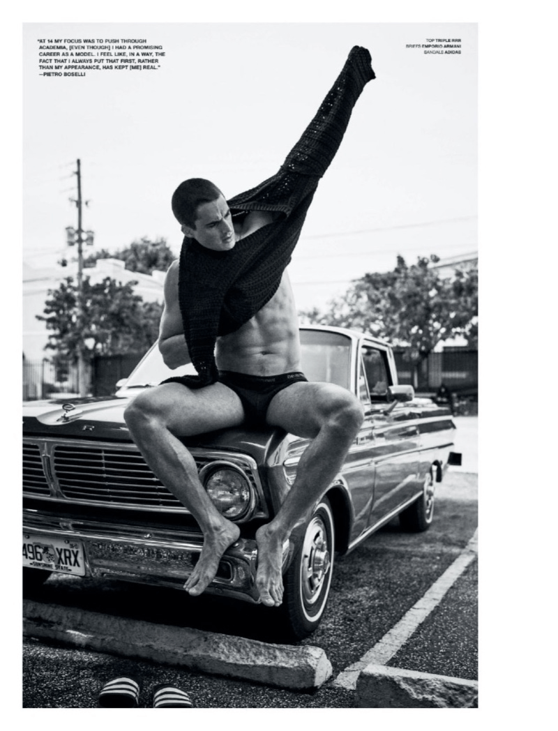 “Pietro Boselli stars in a stripped down story for VMAN. Connecting with photographer Giampaolo Sgura, Pietro poses for a series of black and white images. Meanwhile, George Cortina looks after styling. Cortina outfits Pietro in laid-back essentials and underwear from brands like Versace and Giorgio Armani. No stranger to working with Sgura, Pietro also appeared before his lens for LOVE Moschino.” – TheFashionisto.com