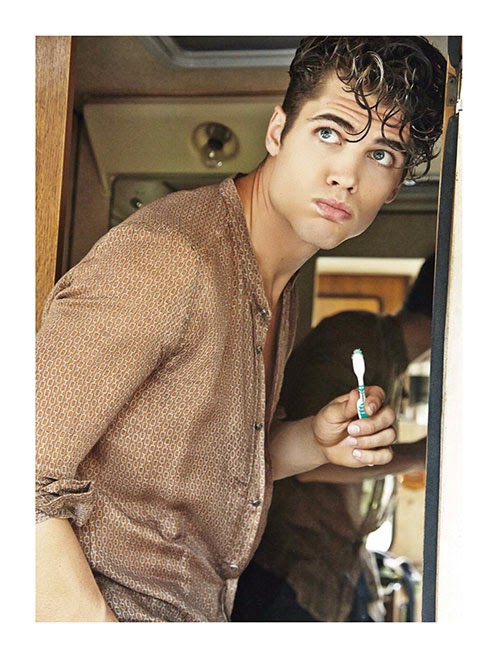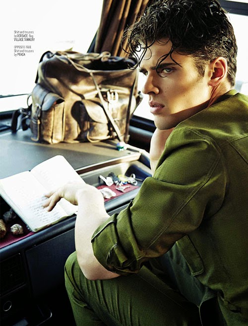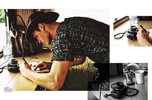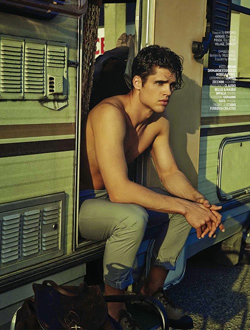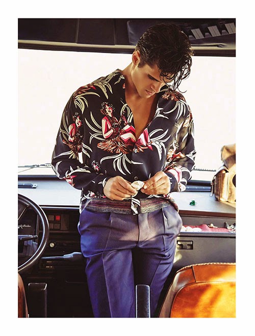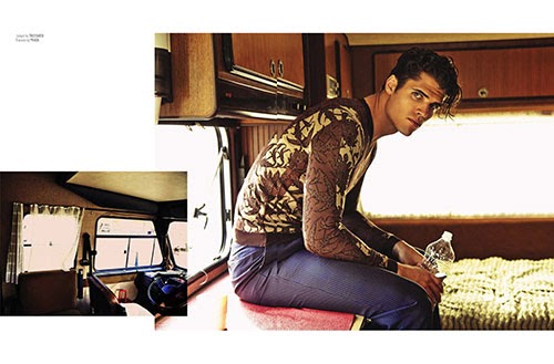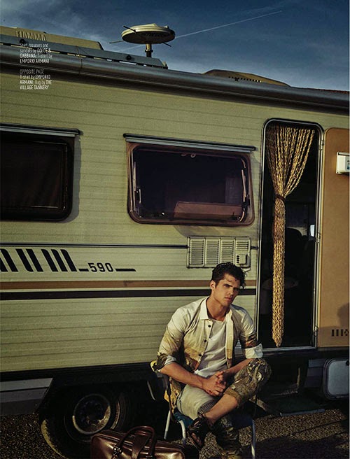 “On the Road–Model Brian Shimansky (Soul) is back in the spotlight again, starring in an editorial for August Man. Photographed by Urivaldo Lopes, Brian gets a camper for a relaxed story set outdoors. Captured lounging about, Brian settles in for a comfortable summer of style. From Emporio Armani to Prada, printed shirts, pleated trousers and other stylish essentials come together under the direction of stylist Fleur Huynh Evans. / Creative direction by Melvin Chan.” – The Fashionisto