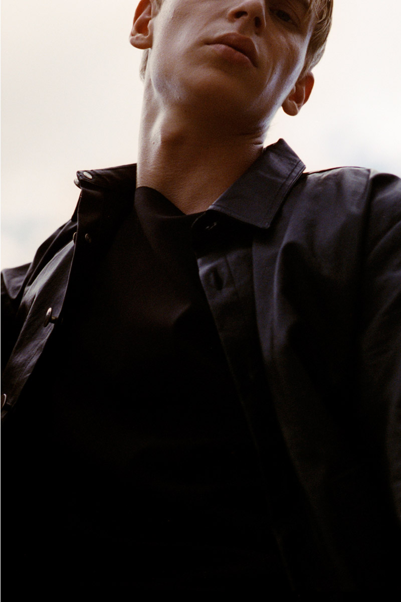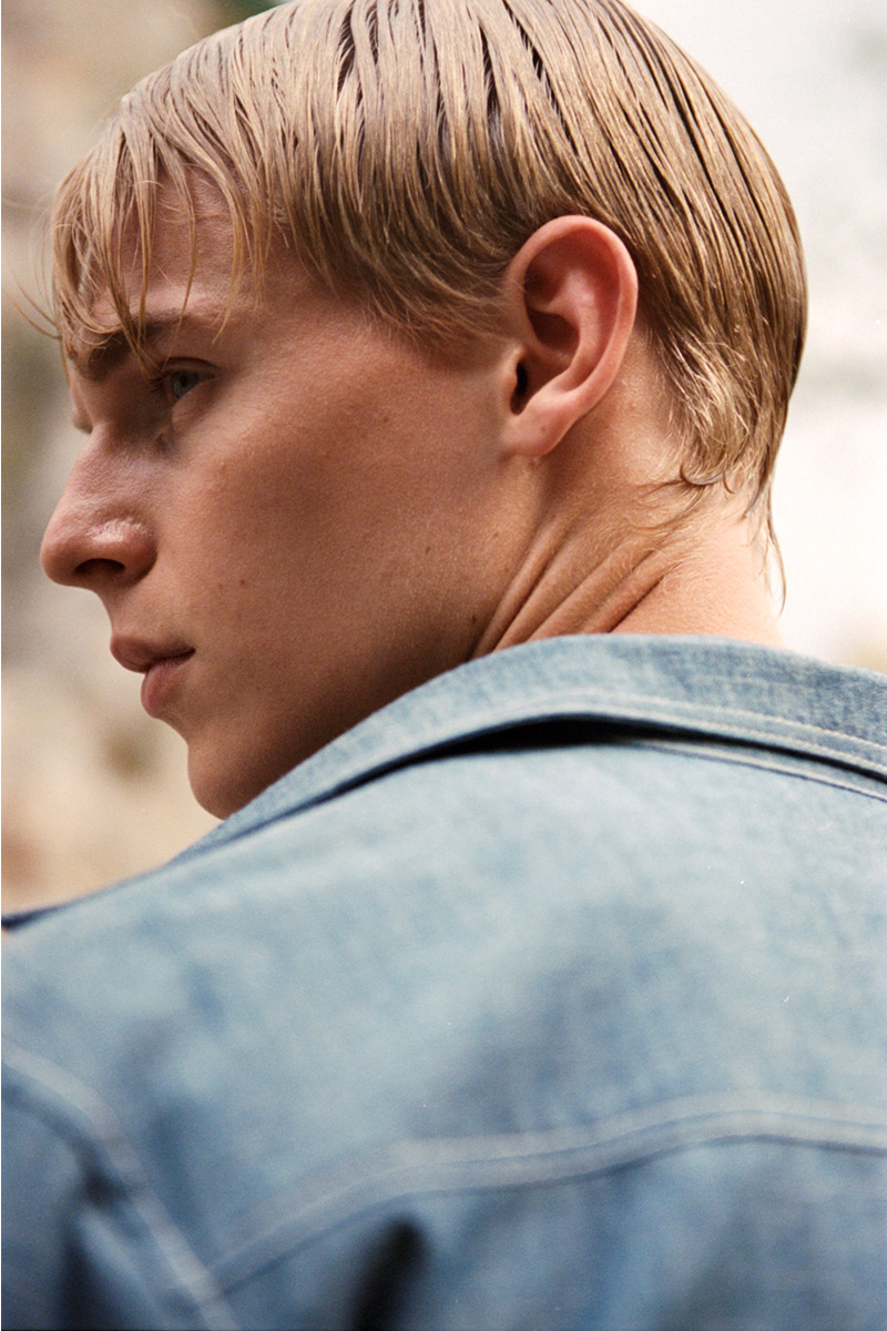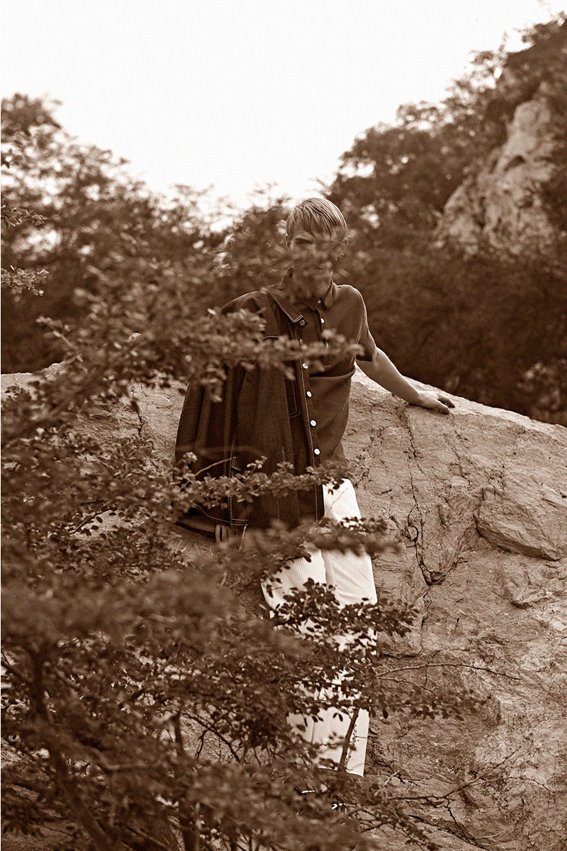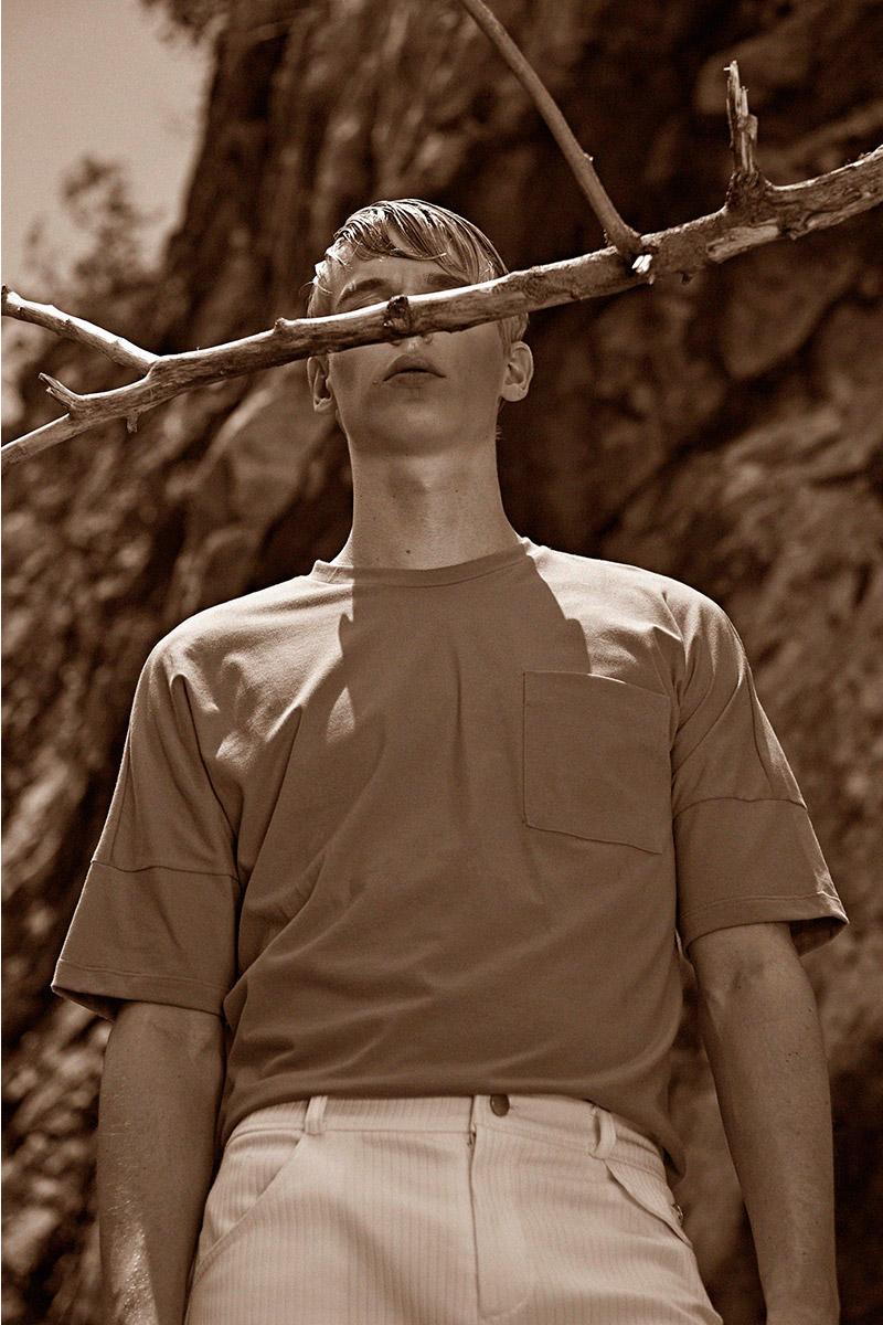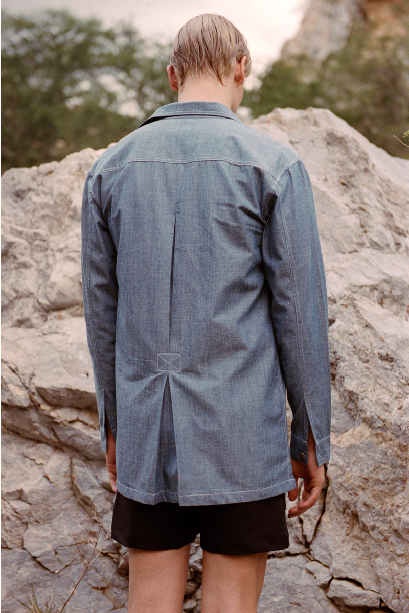 The collection’s key look tells the story of a fisher heading toward the river in denim fisherman jacket over natural-dyed cotton work shirt with white corduroy trousers. Contrast stitching and raw cut edge are the leitmotiv of the collection’s detail; giving subtle, and more graphic shape to the clothes. Colouration is picked from parts of the living seen in nature, ranging from salmon flesh orange, burnt sienna to the nomadic desert.