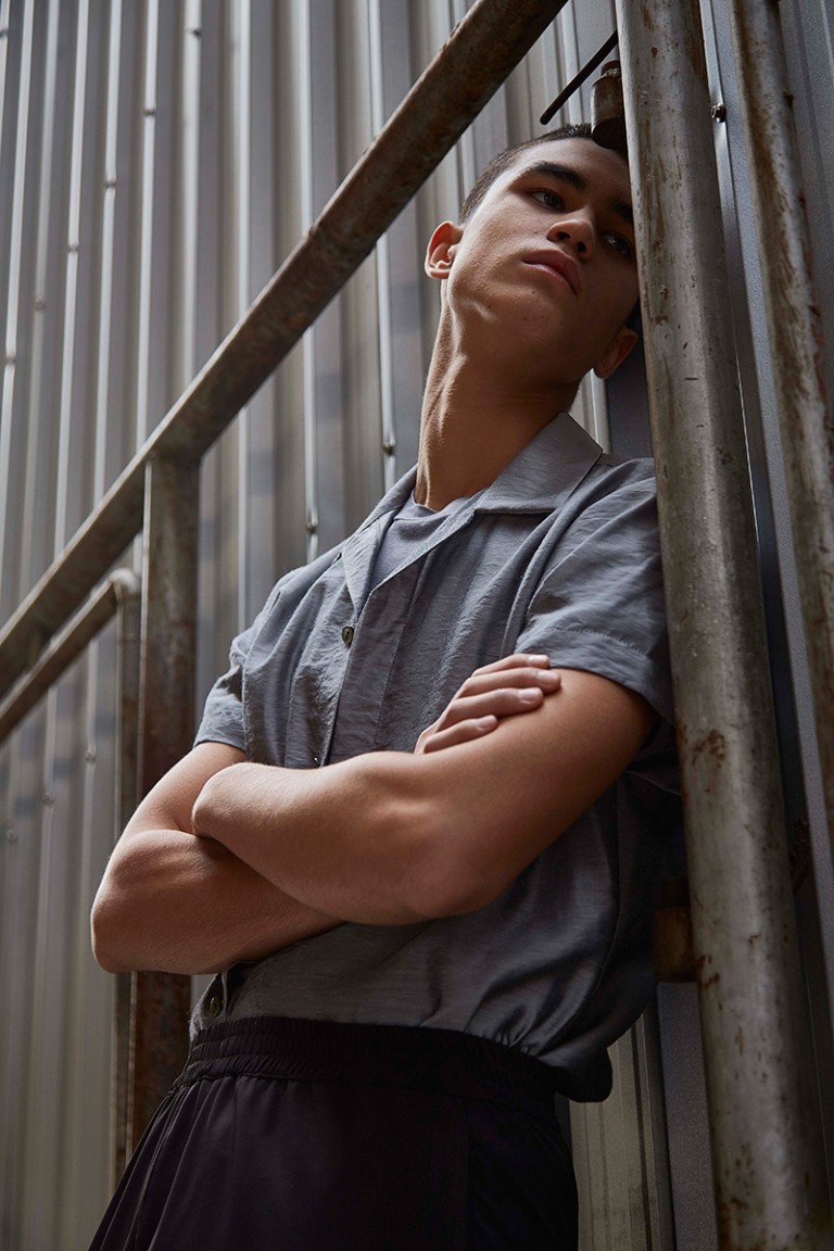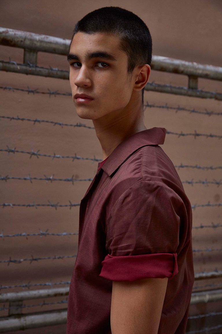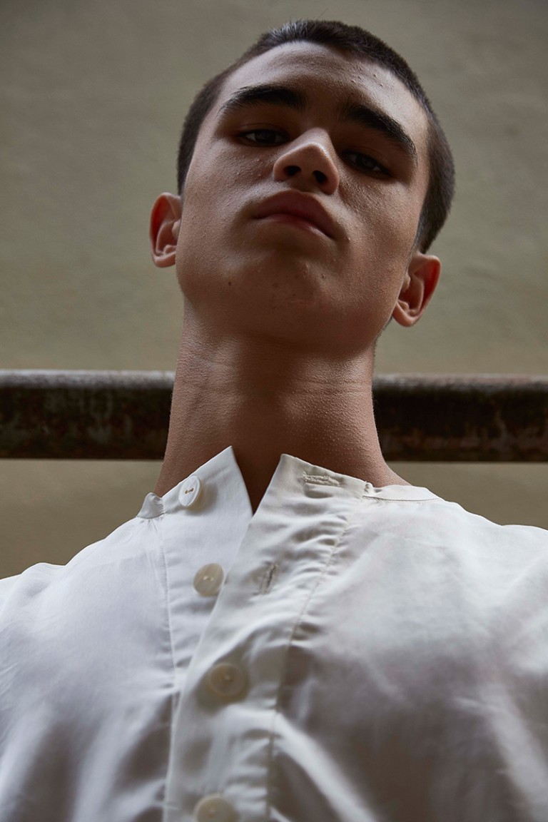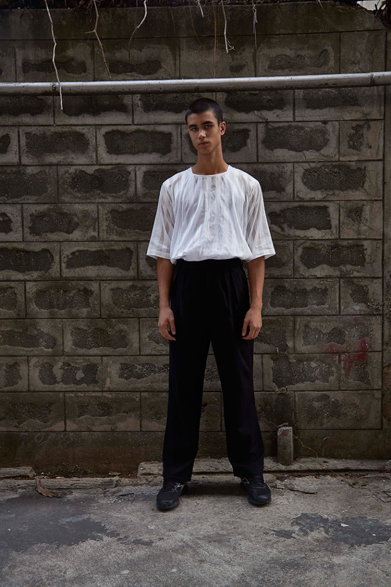 “Carbon released its Spring/Summer 2016 lookbook, featuring Alessandro Bisogni shot by Nucha Jaitip. The designer was inspired by the images of children during the industrial revolution, all looking dusty in their daddy’s size clothing. Dropped-crotch with floor-length trousers and lightweight-satin collarless shirt, which gone faded and wrinkly from time-to-time wear become this collection’s key looks’.” – FY Magazine.es