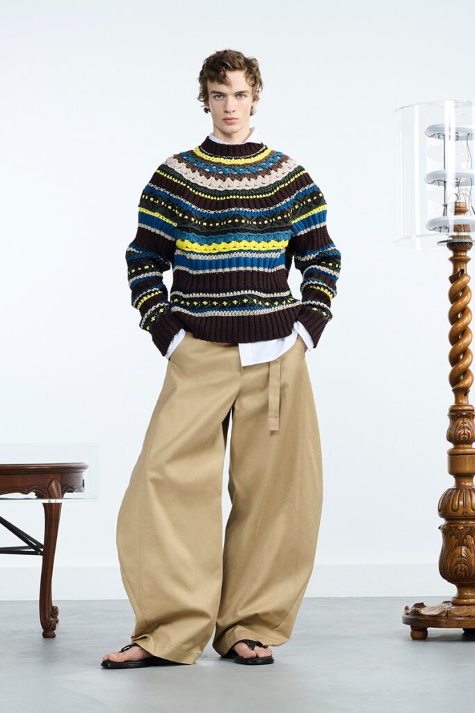 Sacai’s Spring/Summer 2026 collection, designed by Chitose Abe, showcases the brand’s signature blend of innovation and wearability. The collection features a mix of voluminous silhouettes and intricate details, capturing the essence of contemporary fashion. Abe’s unique approach to garment hybridization is evident in the wide, ballooning trousers and voluminous sleeves, which are both a focal point and a testament to her technical prowess.