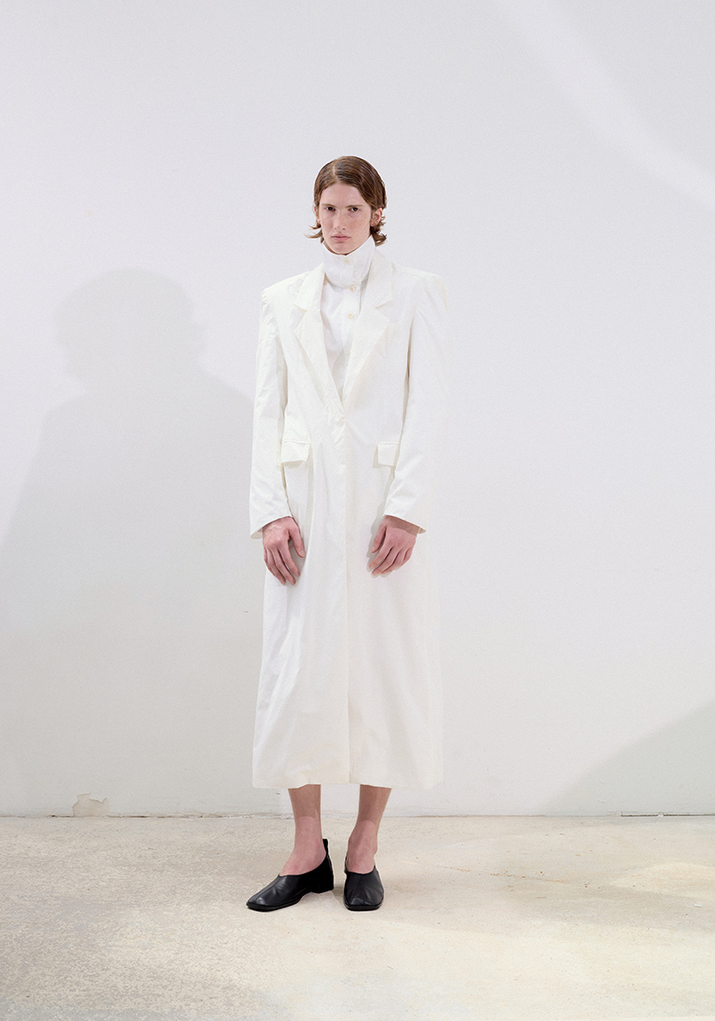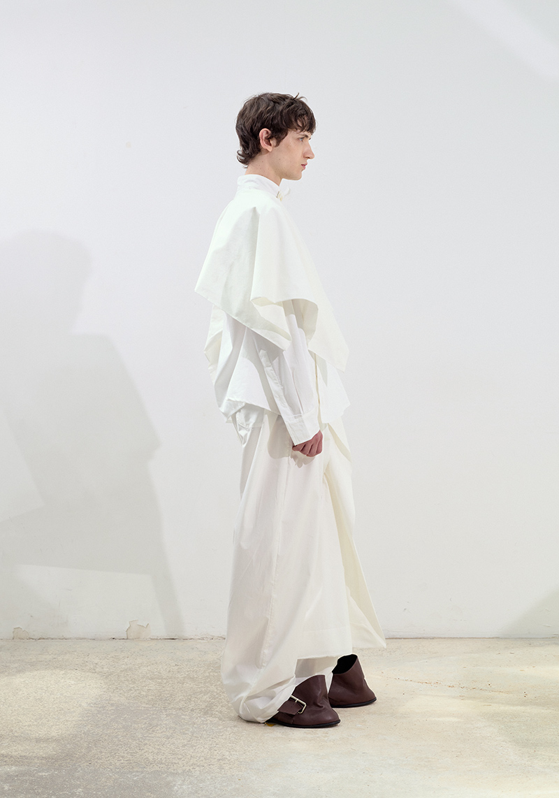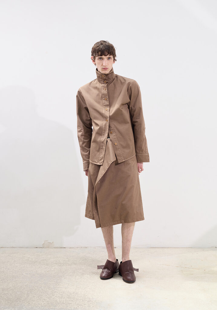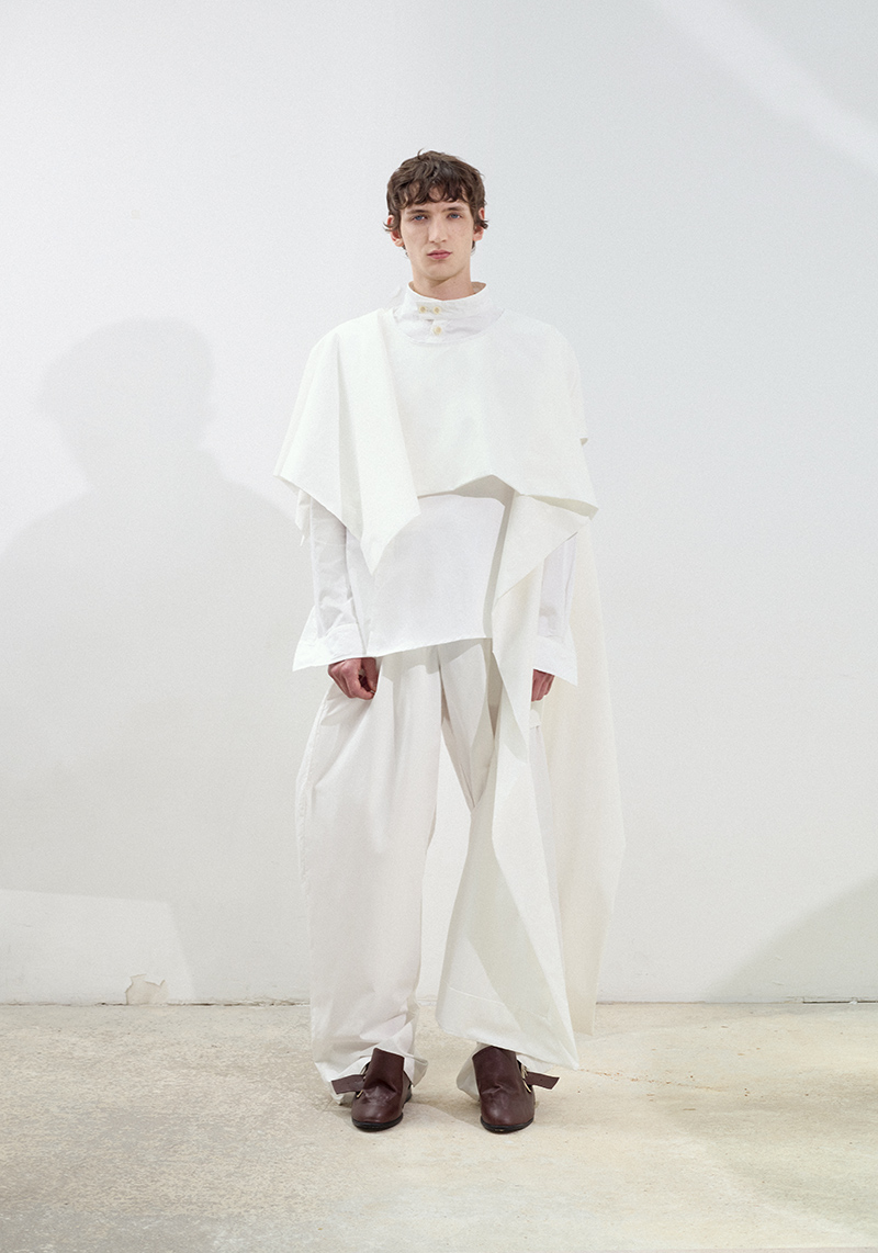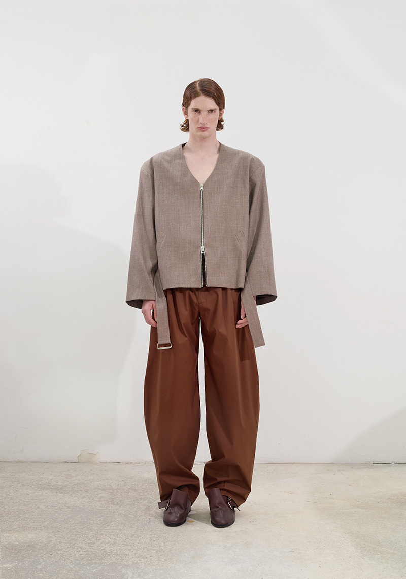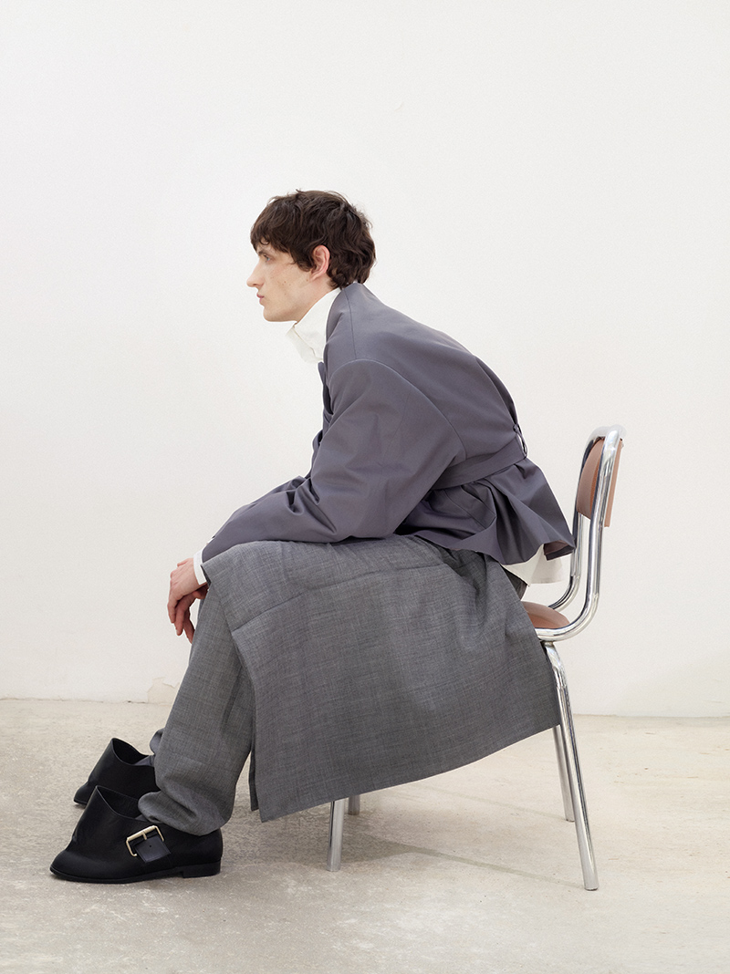 The lookbook captures this tension beautifully: crisp aprons reimagined as outerwear, chore coats with exaggerated collars, and trousers that nod to both function and form. It’s a study in status, visibility, and the emotional labor stitched into every seam.