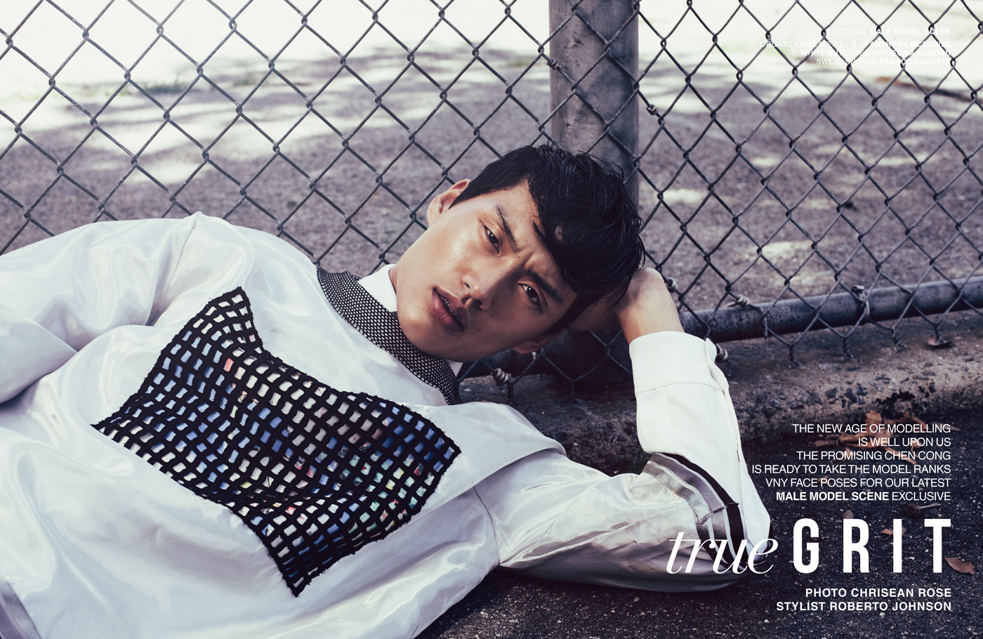 “The promising Chen Cong posing for a striking new MALE MODEL SCENE series shot in New York by Chrisean Rose with strikingly modern styling from Roberto Johnson. True Grit story features pieces from Black’d, Martin Keehn, Berenik, UBU, Adidas, Ijeoma Achonu, 3:23 from Anthony McDowel and Franco Lacosta.