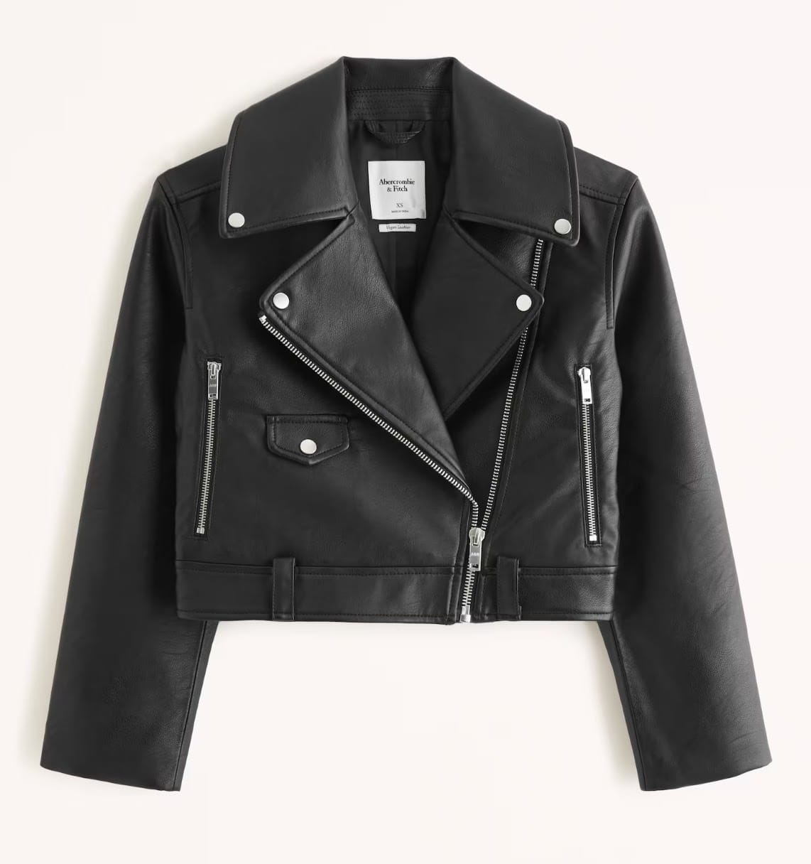 Abercrombie has a more cropped moto jacket that’s designed with a vegan leather material that’s cruelty-free while still being comfortable. If you don’t want it oversized, then the brand recommends sizing down.” – Billboard.com