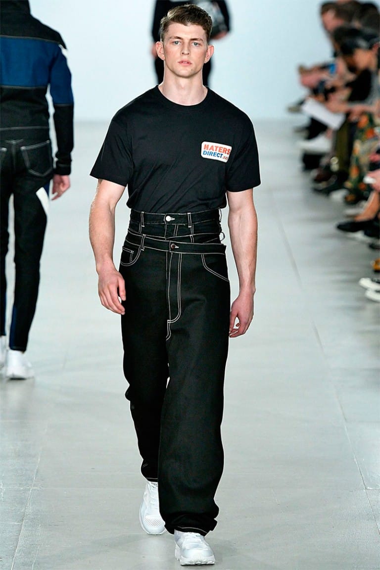 “Sportswear runs predominantly through the show but starts out in the form of denim panelled track suits, following last season’s lead. The second section of the collection sees Michael Morgan of Wilhelmina Models wearing a sweater with a “Haters Direct” logo, mimicking the UK sports mega-retailer, Sports Direct’s, branding.The looks that follow feature “Lovers Direct” and the extra large carrier bags that Sports Direct are known for pushing on you for a £1 charge. The playful quip has a more serious undertone from Shannon, clearly pointing out how vast the generic sportswear industry has become.