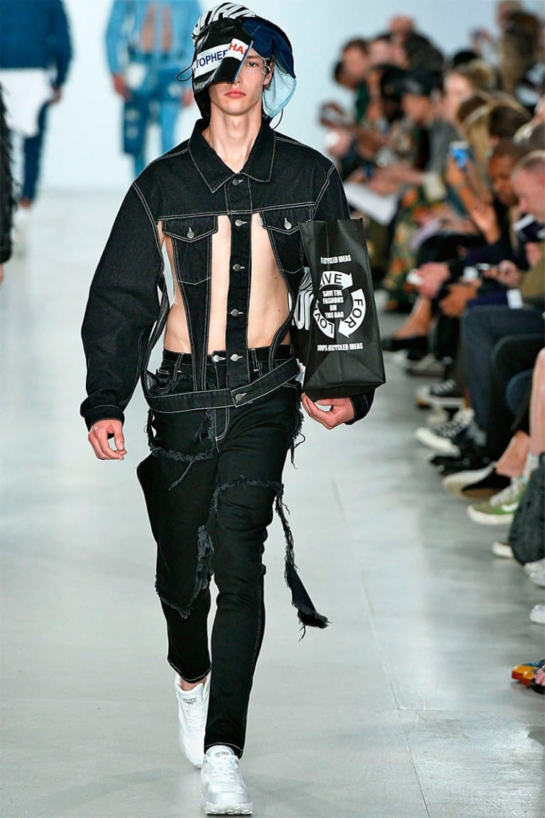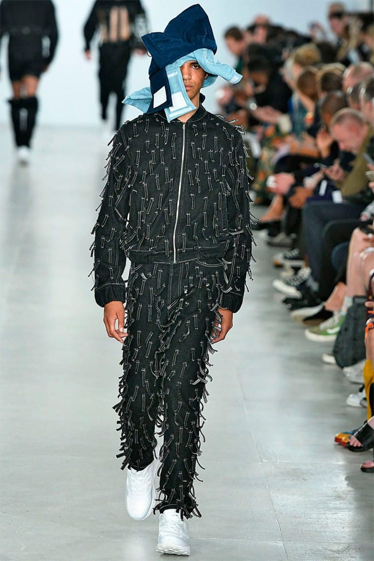 Shannon’s footwear collaboration with sportswear brand Hi-Tec takes the form of bright white mesh trainers inspired by the broken London bus stop glass that we see so often. Sculptural hats constructed of layered denim hoods are seen intermittently throughout the show, worn at awkward angles and half covering the models’ faces. Additionally, Judy Blame has created some woven and twisted rope badges and neck pieces, giving a nod to Robert Mapplethorpe and Blame’s work