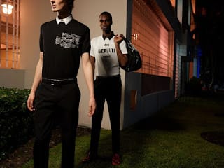 “Bakay Diaby and Dylan Fender tackle the sleek designs of Kris Van Assche for a Berluti editorial. Stef Mitchell photographs the pair for the outing. The models don chic Berluti pieces as they take to the night streets illuminated by city lights. Front and center, Bakay and Dylan impress in a tailored wardrobe. The models wear everything from graphic dress shirts and trim-fit suits to graphic tops.” – TheFashionisto.com