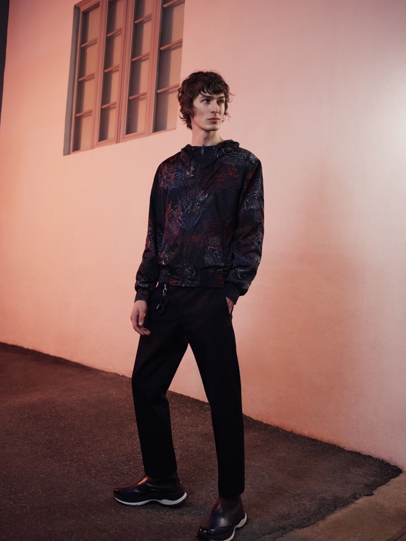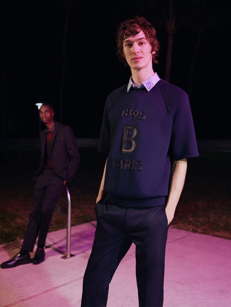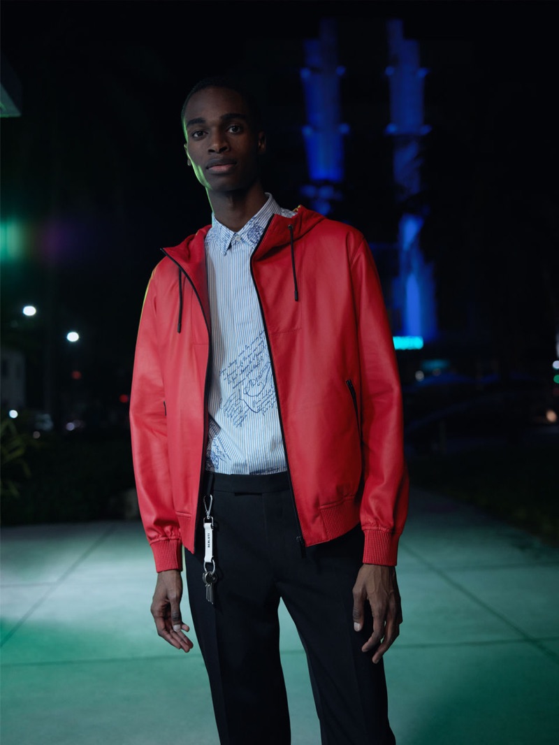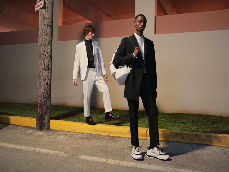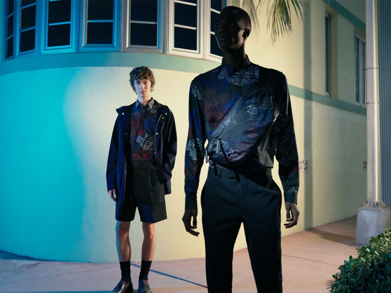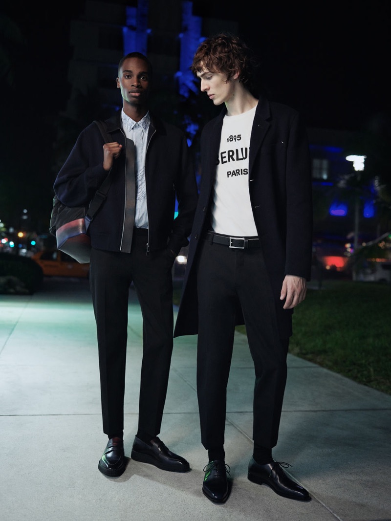“Bakay Diaby and Dylan Fender tackle the sleek designs of Kris Van Assche for a Berluti editorial. Stef Mitchell photographs the pair for the outing. The models don chic Berluti pieces as they take to the night streets illuminated by city lights. Front and center, Bakay and Dylan impress in a tailored wardrobe. The models wear everything from graphic dress shirts and trim-fit suits to graphic tops.” – TheFashionisto.com