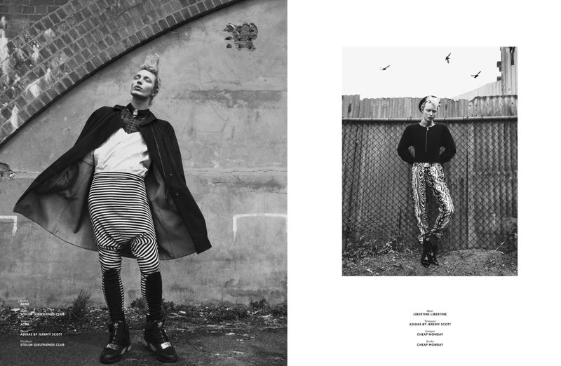 Cooper & Cooper–Chic model Cooper Thompson takes to the back alleys for an eccentrically vibrant photo shoot to be featured in the seventh issue of SVA Magazine. At the helm of the shoot is photographer Petter Karlstrøm and stylist Leigh Dalton who feature a lively Cooper against an urban backdrop whilst garbed in a variety of patterns, colors and textures hailing from labels such as Cheap Monday, Libertine and Stolen Girlfriends Club. / Grooming by Vanessa Collins @ Reload. Courtesy of – thefashionisto.com
