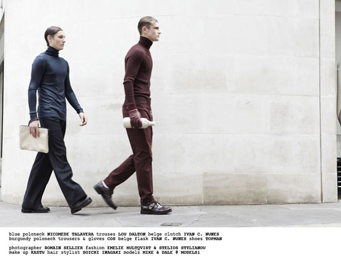 The Lineup–Enhancing the textures of each ensemble put together by Emelie Hultqvist and Stelios Stylianou, Romain Sellier’s minimal photography captures the modernity of menswear in the latest issue of 1883. Dale Cutts and Mike of Models 1 are outfitted in COS, Lou Dalton, Acne and other labels. Courtesy of – thefashionisto.com