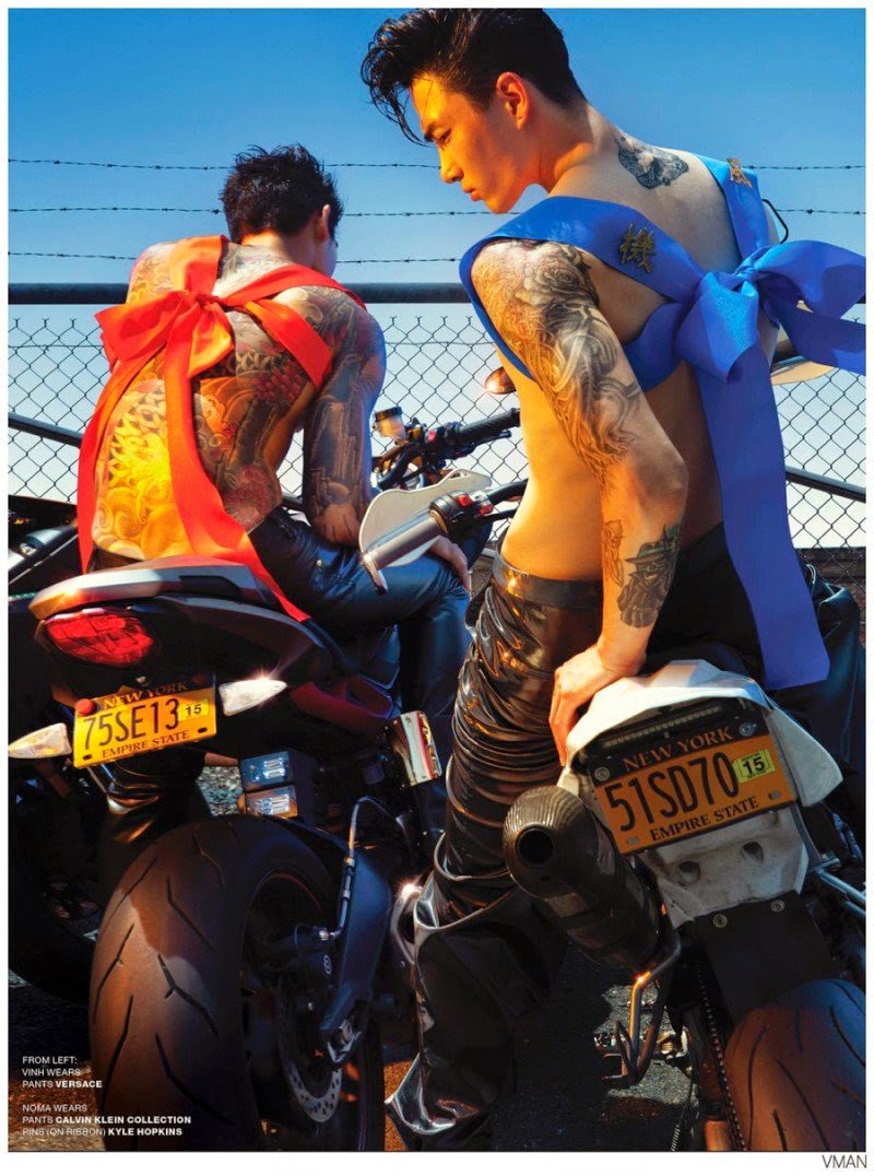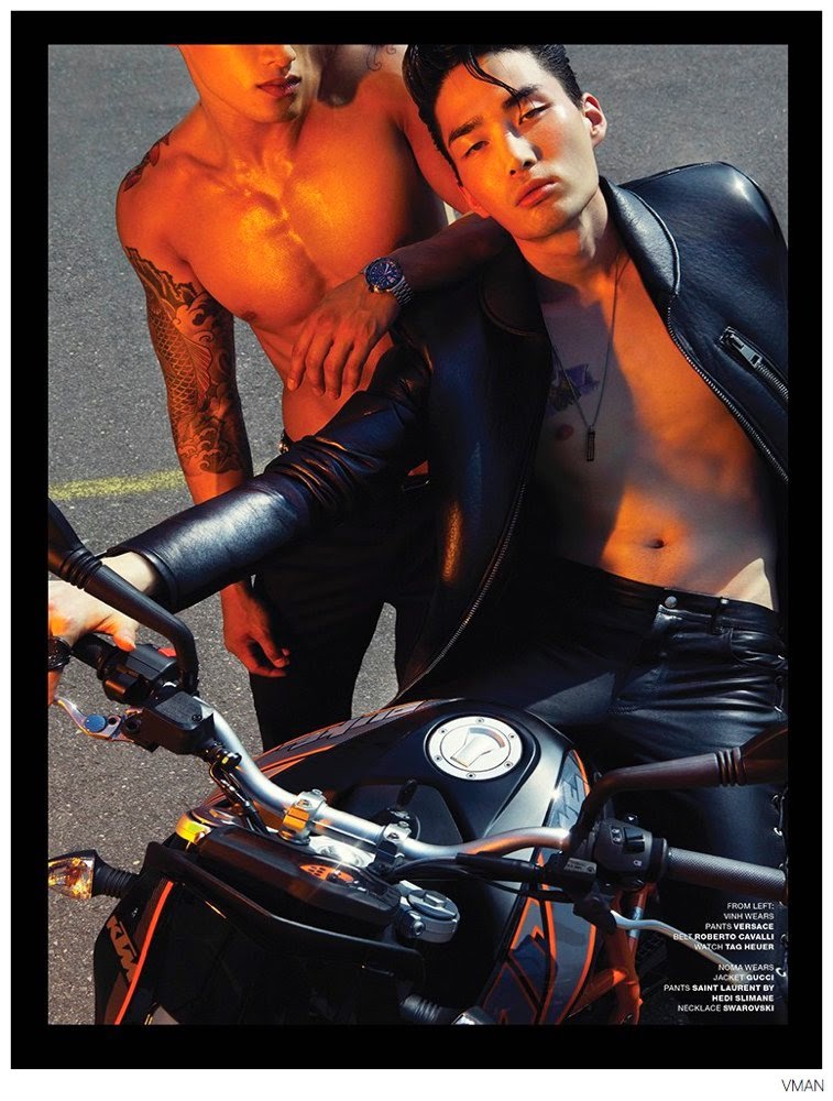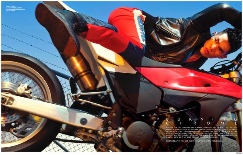 Burning Chrome-Photographer Meinke Klein and stylist Anna Trevelyan connect for the fall/winter 2014 edition of VMAN, serving up a moto style story. Offering a sleek fashionable spin on leather classics, Trevelyan styles models Danny Lim, Daniel Liu, Noma Han and Vinh in minimal fashions that are elevated with details and dynamic posing. Courtesy of – thefashionisto.com