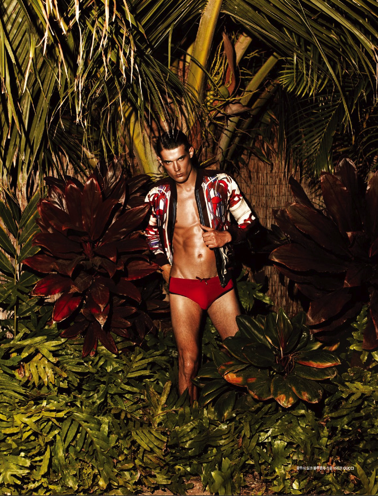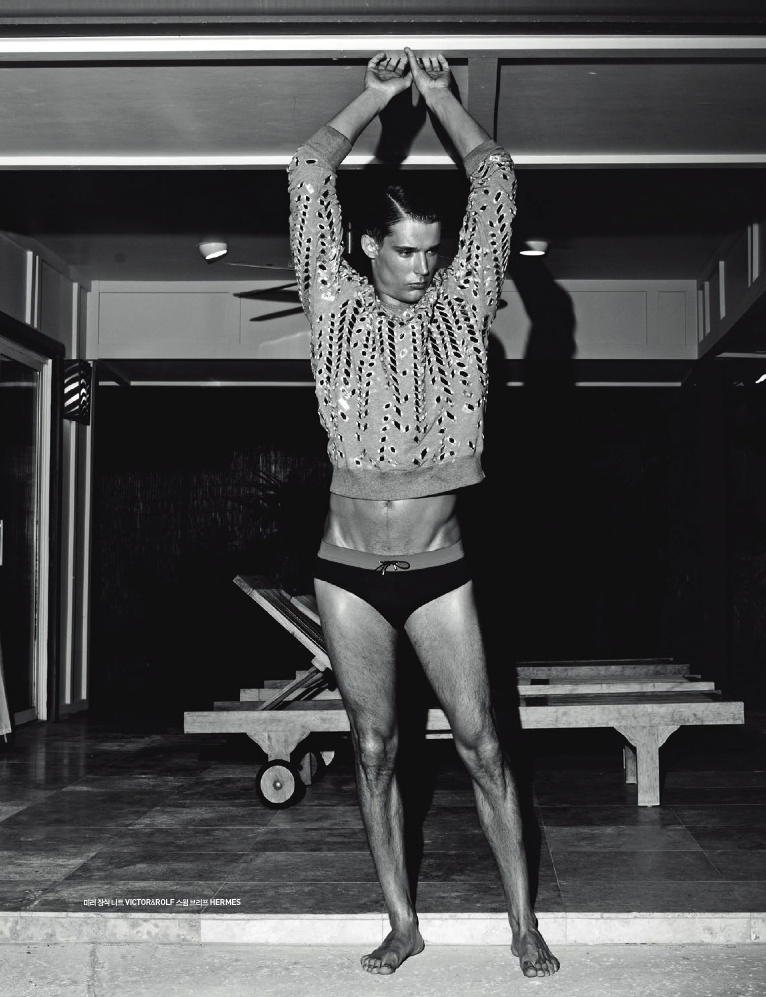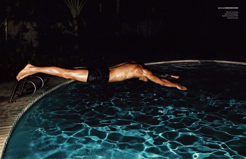 Night Pool–For the latest issue of GQ Style Korea, British model Danny Schwarz spends some restful moments poolside, posing for Jang Hyun Hong’s lens. Captured at night in his luxurious mansion, the VNY model is styled by Jee Young Kang in a selection of beachwear designs that includes pieces from the likes of Tom Ford and Hermès, mixed with Viktor & Rolf’s sparkling sweatshirts, Alexander McQueen’s luxurious tuxedo jackets, Gucci’s colorful designs and many more. / Grooming by Hea Kyung Lim. Courtesy of – thefashionisto.com