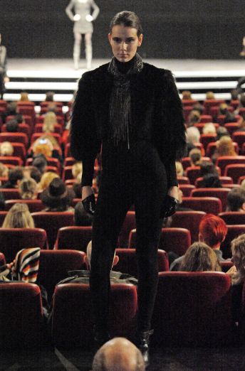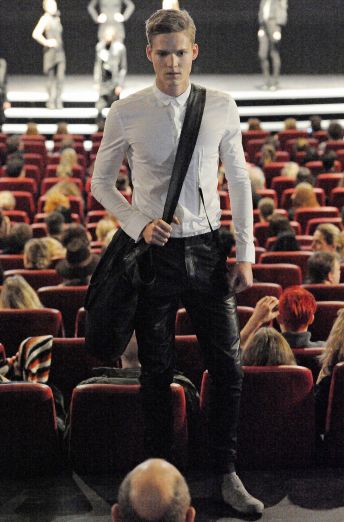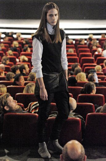 Taking a page from Gareth Pugh, Andersen showed a 3-D fashion film to present his collection. At the end of the film–very kaleidoscopic, black and white and Pugh-inspired–Andersen sent out real live models, too, who walked the aisles of the movie theater as if it were a catwalk and not carpeted in a tacky red and gold-print carpet lined with exit aisle lights. The clothes were less spectacular than the show but consistent, hyper-androgynous, and street-cool nonetheless–lots of tight black leather, slouchy tanks, and white button-downs that took some inspiration from Rick Owens. And in keeping with today’s androgynous model trend, Andersen’s male models were gorgeous enough to give model-of-the-moment Andrej Pejic a run for his money.