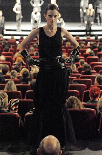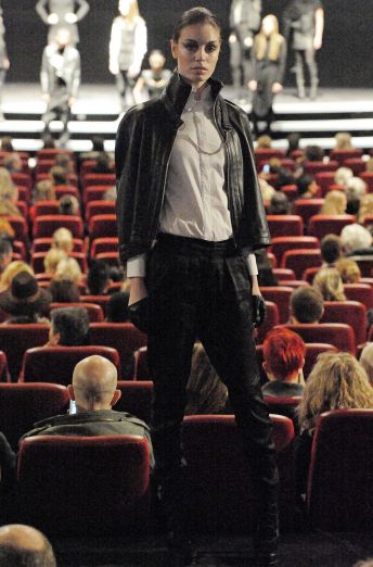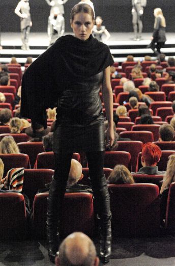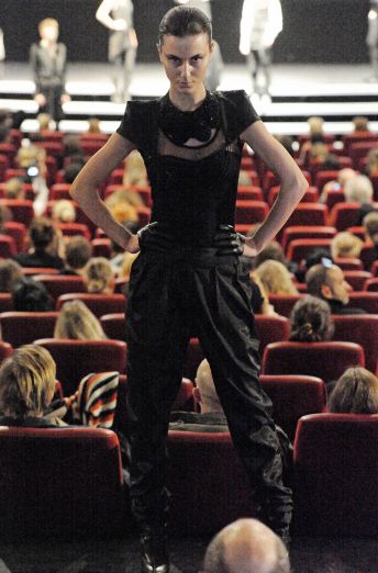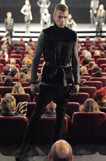 “David Andersen is known for his hard-edged androgynous menswear–he’s used women to model his menswear in the past. Both Diddy-Dirty Money and Paris Hilton have worn his pieces (if your mindgrapes can handle that). This year, his label David Andersen Denmark launched women’s ready to wear at an IMAX movie theater in the heart of Copenhagen.