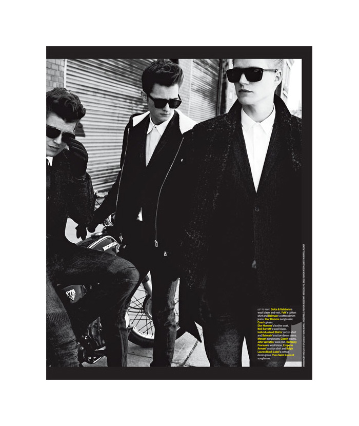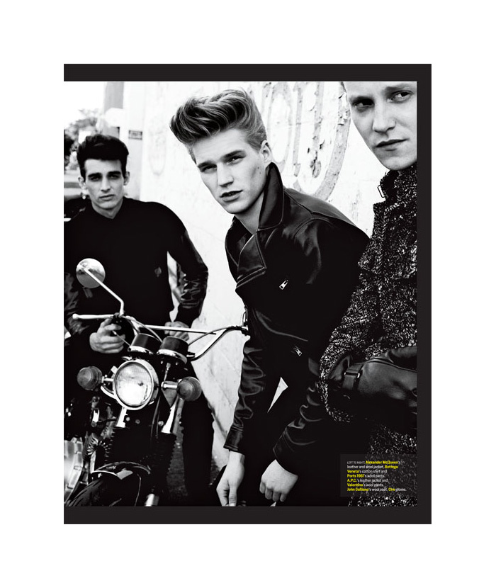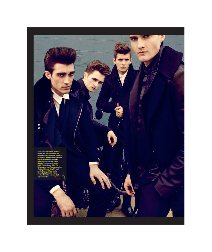 Retro 101–Brennen Steins, Steven Keating, Daniel Hamaj, Jeremy Simpson, Matthew Hitt and Stephan Haurholm come together for a retro-inspired outing for Menswear magazine. Donning leather biker jackets, denim, cool blazers and pulled coifs, the handsome lot are photographed by David Roemer and styled by Alex Badia. / Grooming by Riad Azar (Opus Beauty). Courtesy of – thefashionisto.com
