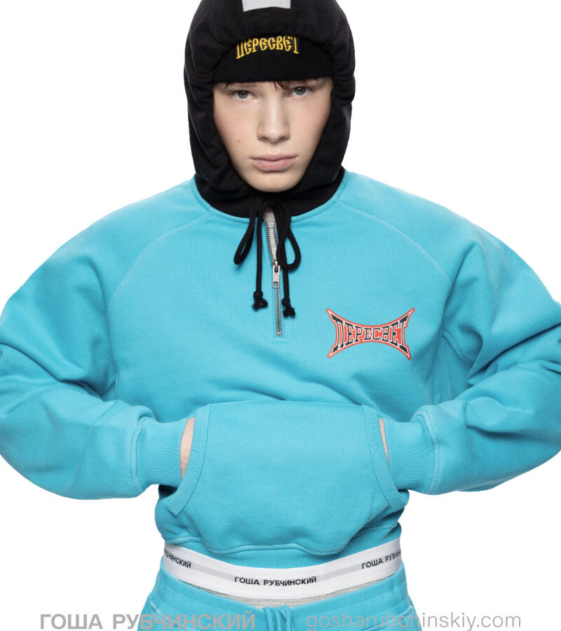Model wearing a turquoise hoodie and pants with a black hooded balaclava; branded chest logo visible. Gosha Rubchinskiy unveils his bold new “PERESVET” campaign exploring athletic form.vGosha Rubchinskiy unveils his bold new “PERESVET” campaign exploring athletic form. Gosha Rubchinskiy unveils his bold new “PERESVET” campaign exploring athletic form. Model wearing a turquoise hoodie and pants with a black hooded balaclava; branded chest logo visible. Gosha Rubchinskiy unveils his bold new “PERESVET” campaign exploring athletic form.vGosha Rubchinskiy unveils his bold new “PERESVET” campaign exploring athletic form. Gosha Rubchinskiy unveils his bold new “PERESVET” campaign exploring athletic form.