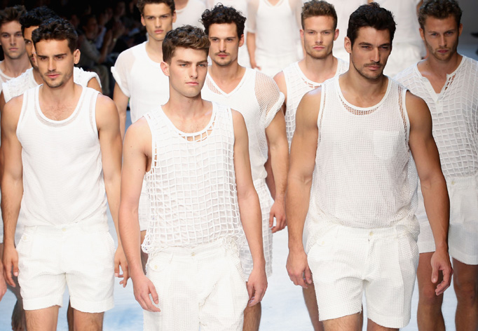“For the first men’s collection at John Galliano without its namesake designer at the helm, the look for Spring 2012 was a ‘Big Splash.” The line was a homage to the 1974 David Hockney film “A Bigger Splash” and featured a 1960s London themed-collection. Military coats and Navajo knits fit in perfectly among the classically Galliano men in underwear and small swimsuits.”