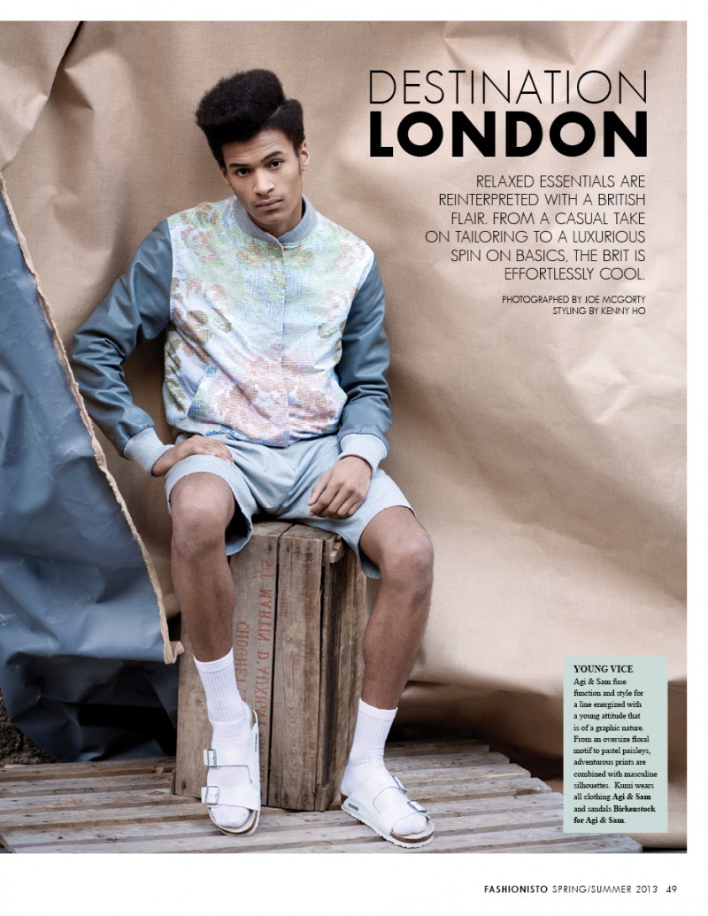 Destination London–Photographed by Joe McGorty for Fashionisto #7, Kumi Keazor (Models 1), Brandon Hill (Elite London) and Michael Roberts (M&P) come together for a style feature on London-based designers. Pulled together by fashion editor Kenny Ho, the boys strike a boyish pose in garments from Lou Dalton, Agi & Sam and more. / Hair by Franco Vallelonga @ Era Artist Management using Shu Uemura Art of Hair. Makeup by Salina Thind @ Aart London using Clinique. Photo assistance by Rowan Spray. Special thanks to Hoxton Arch Studio. Courtesy of – thefashionisto.com