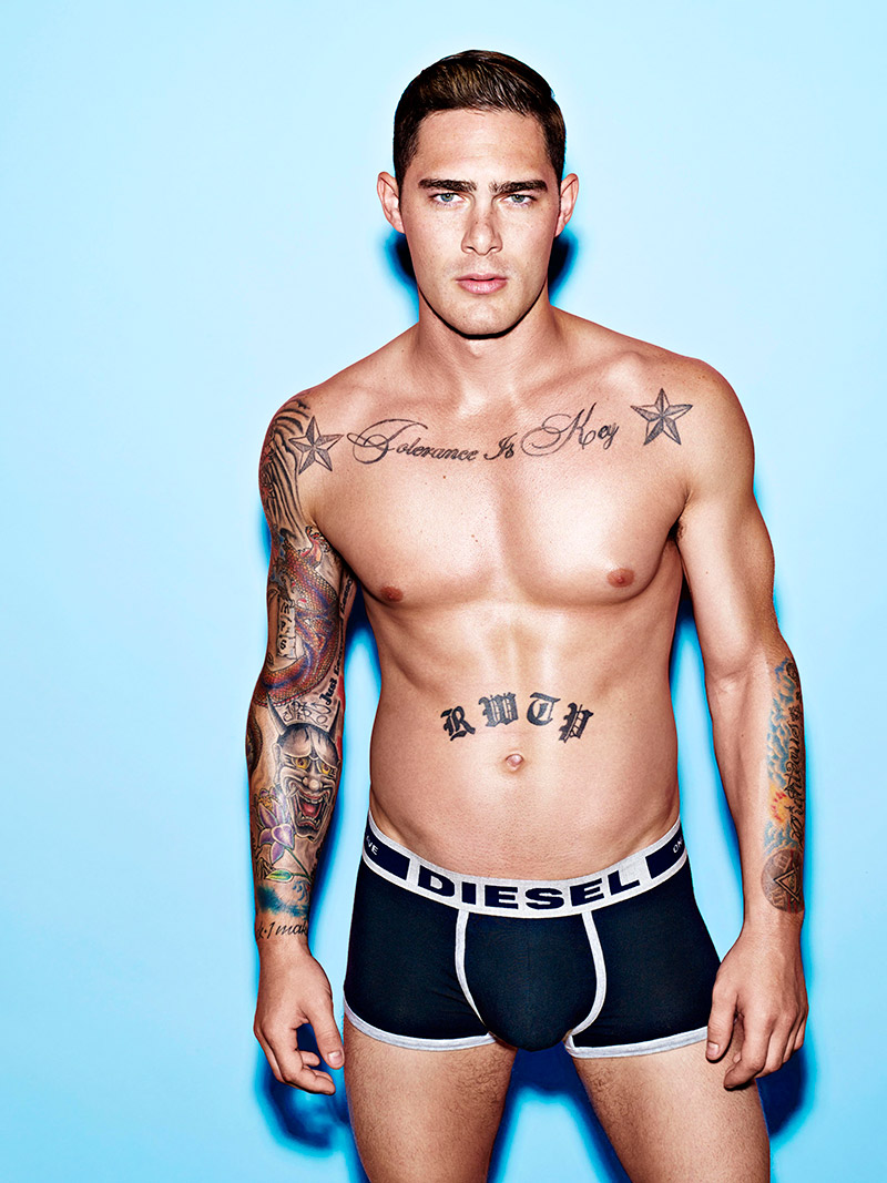 “Diesel presents the Hero Fit, a revolution in men’s underwear. Contemporary and comfortable, Diesel’s newest fit is shaped with a focus on fabric, form and function. Melding a natural textile with technical savvy, the Hero Fit features a duo of iconic men’s underwear styles constructed with extreme comfort and pure softness, a boxer brief and classic briefs. Breathable, natural cotton fiber Modal, soft and comfortable on the skin, is cut into body defining fits that skim and flatter the torso. This new contour defining construction shapes and enhances at the front and lifts and defines at the back.” – FY Magazine.es