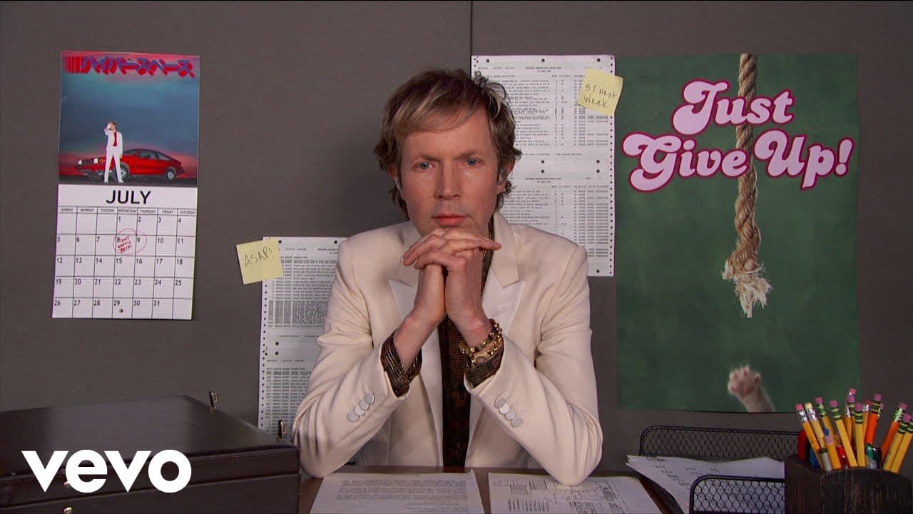 Beck opened the performance by simply singing “Uneventful Days” in a cubicle complete with a “Hang in There” poster. The cubicle walls were then stripped away and the camera followed as he floated around his band for a few laps before returning to his boring cubicle — only now his “Hang in There” read “Just Give Up!”
