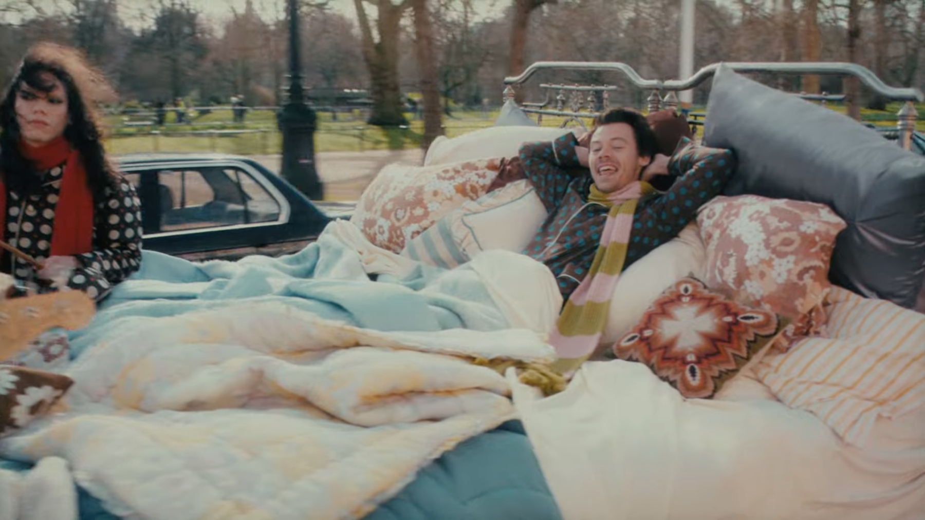 The Grammy winner first teased the new video two days prior to its release, posting a short trailer to the official Harry Styles HQ Instagram account. The snippet previewed the video’s credits scene when Styles lies in bed and whistles the tune of “Late Night Talking” while shaking his feet to the beat, before cutting to a second shot of him wrapped in blankets, wearing pink polka-dot pajamas and smiling from ear to ear.