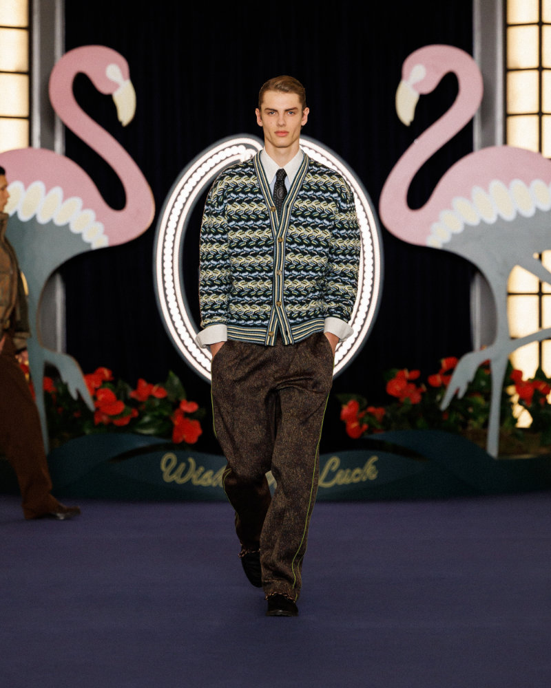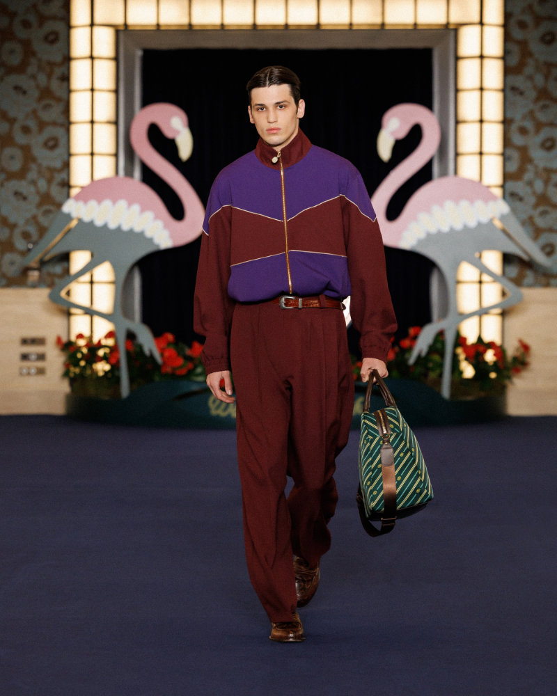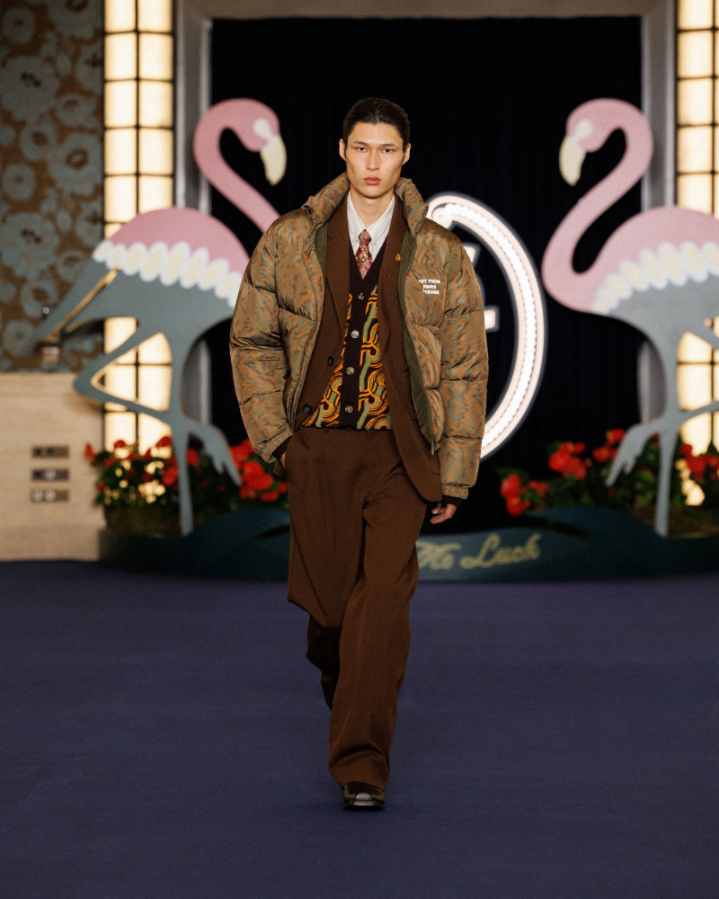 The palette stayed grounded — earthy browns, muted olives, creams, and the occasional deep burgundy to keep the eye awake. Fabrics carried the story: brushed wool, quilted cotton, velvety knits, and technical outerwear that still felt cozy rather than cold.