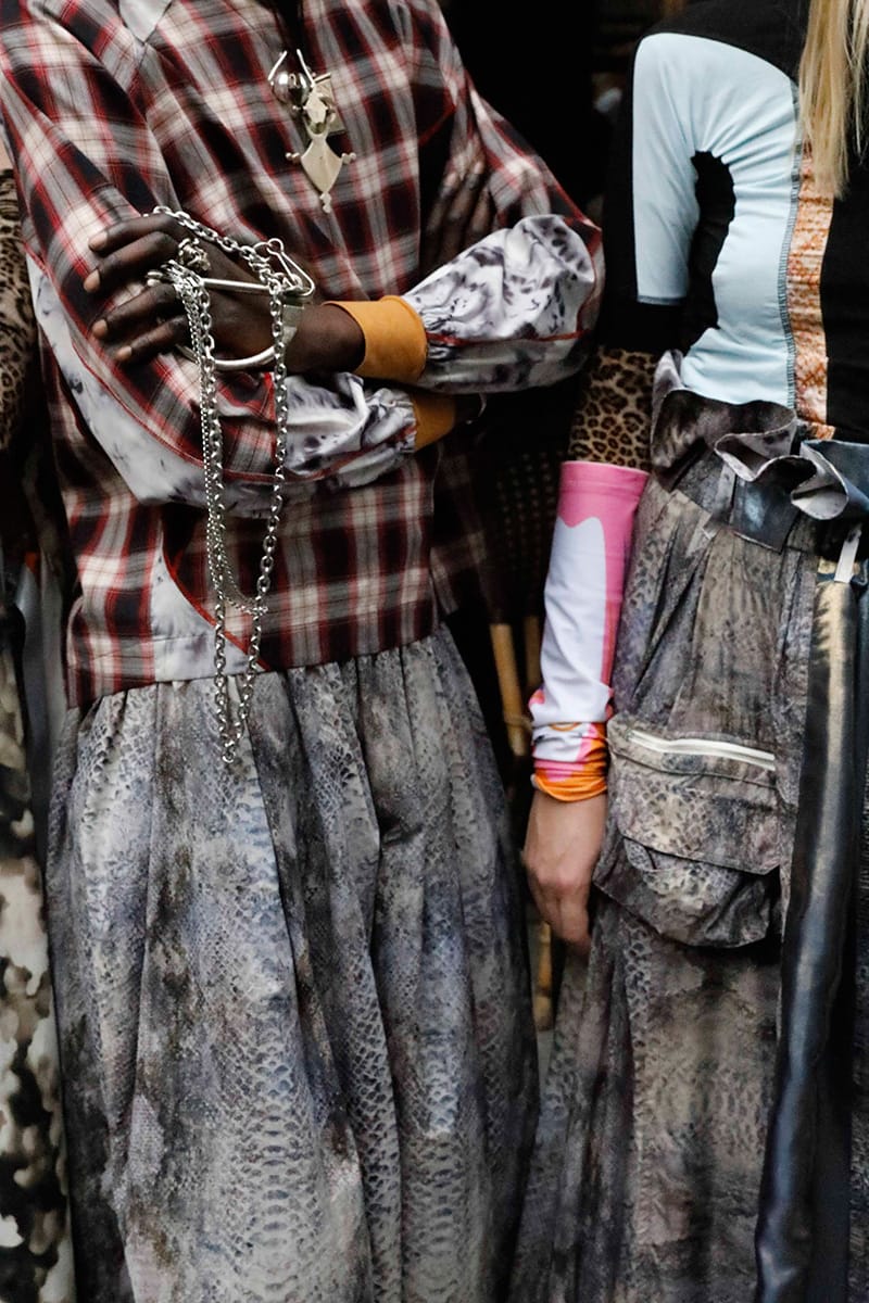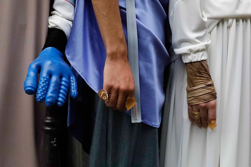 Titled “Kebaby“, this collection is an amalgam of numerous inspirations, usually deriving from the most mundane details of daily life that go unnoticed. What lies at the core is the aesthetics of a defunct Turkish kebab shop once encountered in Pigalle. The collection narrates states of in-betweenness, being constantly in transit and experiencing non-places. Rave culture merges with monastic elements. Featherweight nylon dusters, floor-sweeping trousers and caftans, and athletic performance-inspired gear come together in the form of couture sports. Liquid high-tech jerseys, ultra-lightweight running fabrics, and heavy denim shape a post-gender, post-ethnic language. Animated with subdued theatricality, the clothes play with weight and movement in a way that has a direct impact on self-perception and wearer’s attitude.” – FY Magazine.es