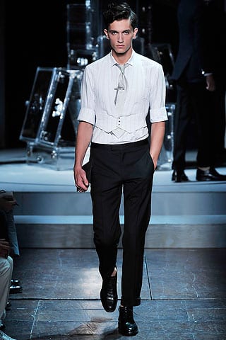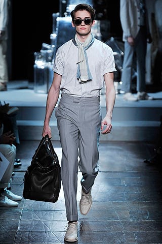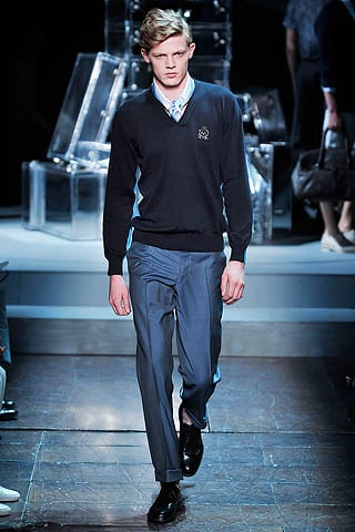 ‘Dunhill, a brand with an impressive legacy of keeping men immaculately and relevantly dressed without forgoing the English gentlemen look. For his second catwalk presentation in Paris, Kim Jones firmly used his references in reverence to Dunhill’s history. Realigning British style, he’s determined not to take Dunhill far away from its core audience and he did so by keeping the collection traditonal and simple. Gray formal wear was polished and restraint, while casual-day-wear was Riviera-inspired and involved neat navy cardigans and boating-inspired shorts. Evening wear was beautifully tailored and continued the theme of classic understated clothing.’