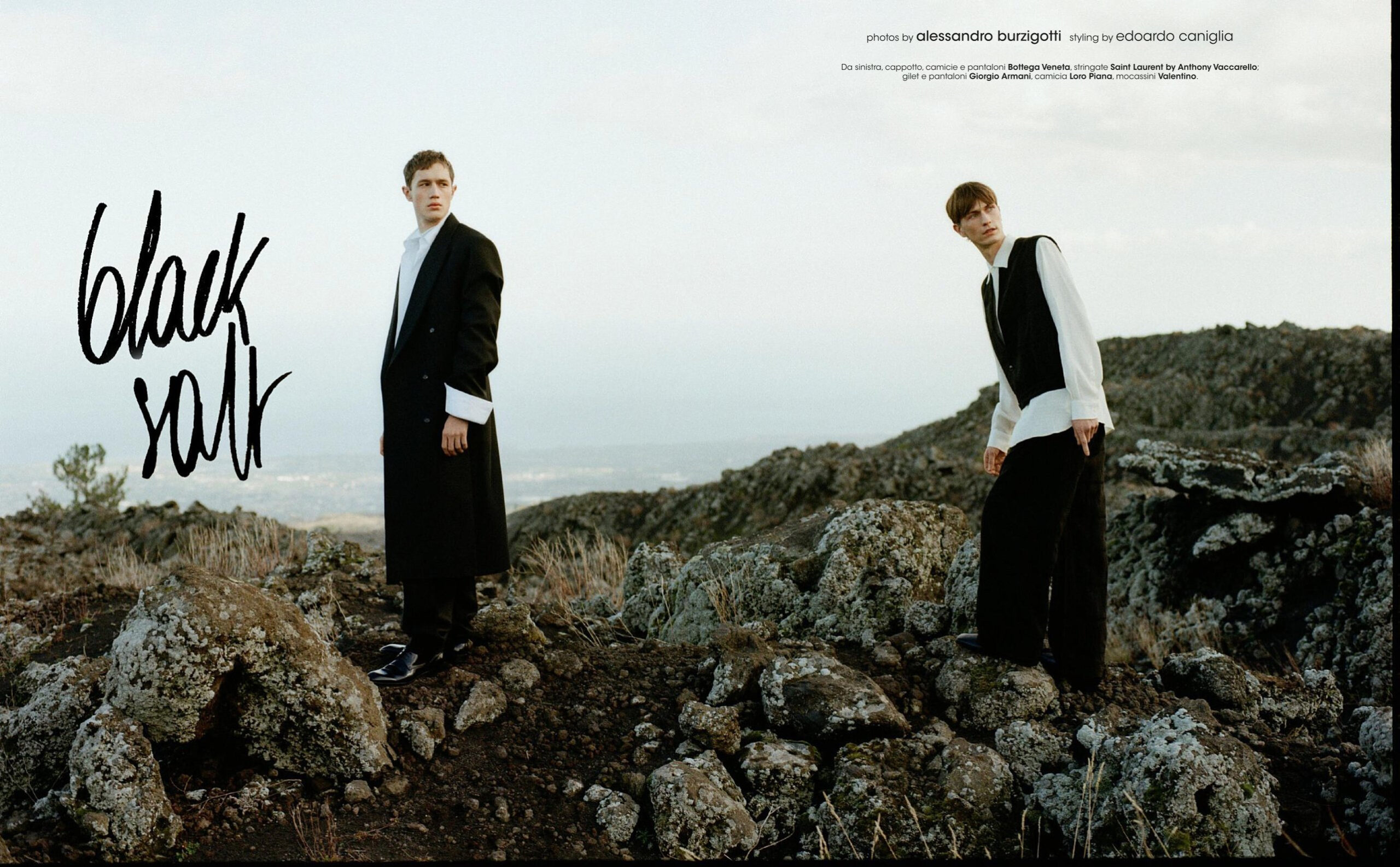 In a story editorial entitled, “Black salt” twosome models Achille Genet and Emile Danckaert are shot in the Italian city of Sicily.
