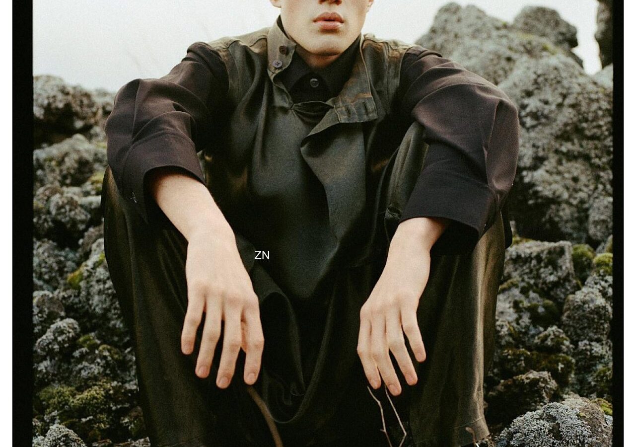 Young man in dark, oversized coat sits on mossy rocks outdoors, looking at the camera with a neutral expression; fashion editorial shot. Young man in dark, oversized coat sits on mossy rocks outdoors, looking at the camera with a neutral expression; fashion editorial shot.