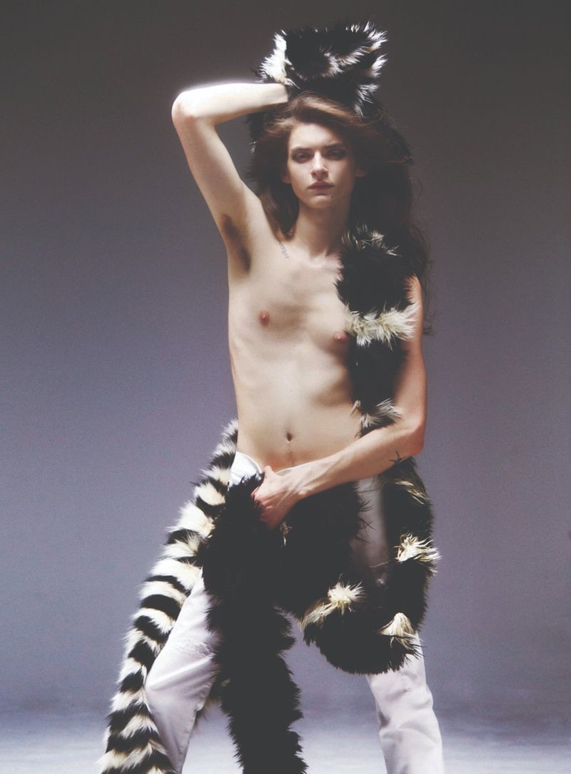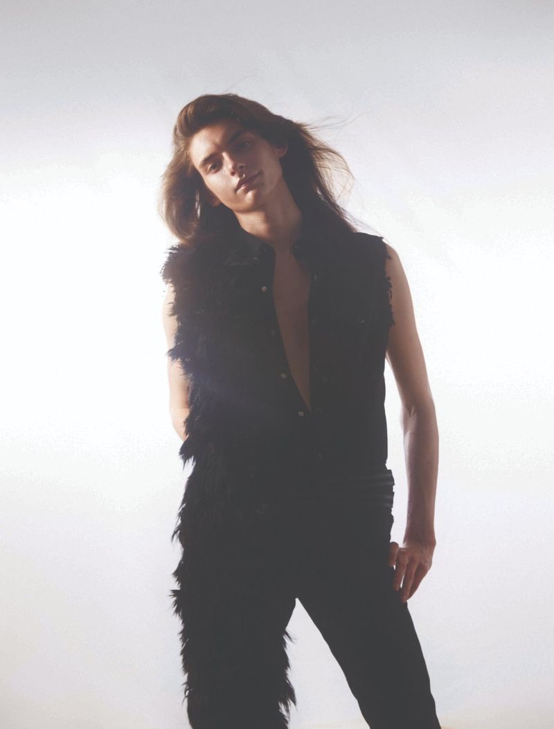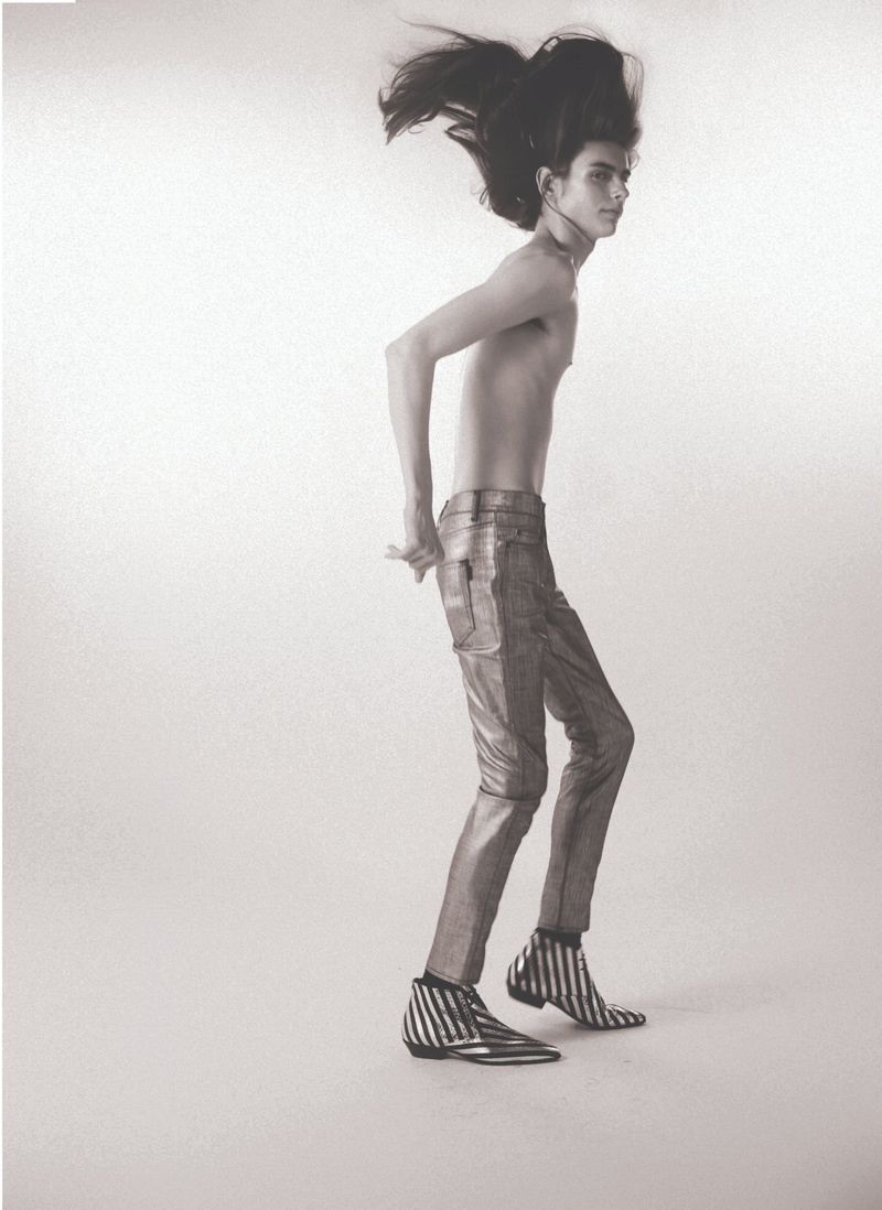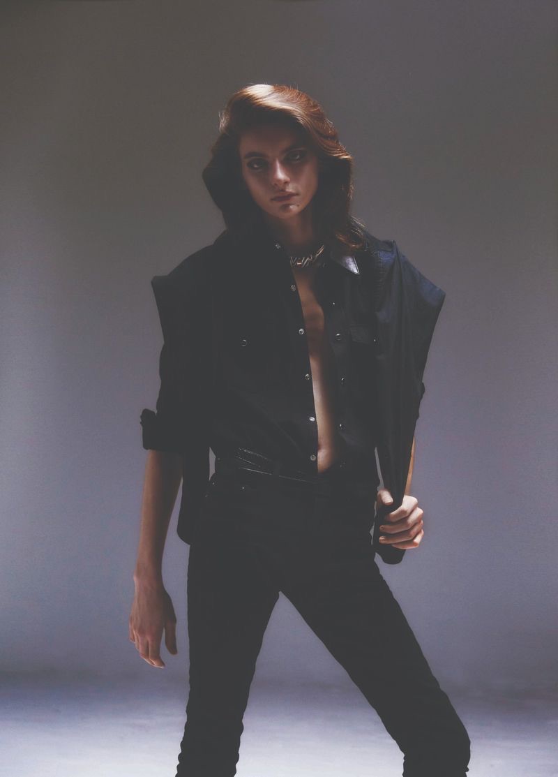 “Dylan Christensen is a svelte vision for 10+. Clad in Saint Laurent, Dylan stars in a cover story lensed by photographer Carlijn Jacobs. Wearing a season of Saint Laurent staples, Dylan is styled by Vincent Levy. An androgynous attitude prevails with a wardrobe of skinny jeans, sleeveless tops, statement jackets, thin belts, and leather boots.” – TheFashionisto.com