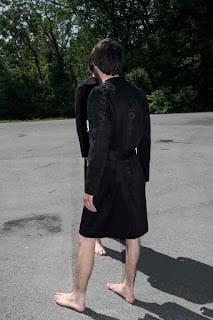 The collection is called “Rust Bloom” and results from applying a specific technology in fabric production and combining contemporary patterns with 17th-century ones. The collection’s name summarizes the inspiration, motifs, and processes used in its production. Rust is a compound of hydrated iron oxides and results from corrosion, as the construction materials deteriorate owing to the chemical activity of fluids. The golden brown pattern on clothing has been obtained by the process of coins rusting on wet fabric or a ready garment, which means that more than 100 hours and specific circumstances were needed to produce it. Rust peels off and detaches itself from the iron surface, which is reminiscent of blooming. On the surface of garments, oversized names of protagonists from William Shakespeare’s play The Tempest, supposedly written in 1610/11, have been embroidered. In Shakespeare’s times, rust was used more frequently than today, in painting as well as textile dyes. The motif of potato flower has been featured in the collection by using the screen-printing technique. Owing to a shipwreck, the potato arrived in Europe during Shakespeare’s lifetime and became a primary staple food.