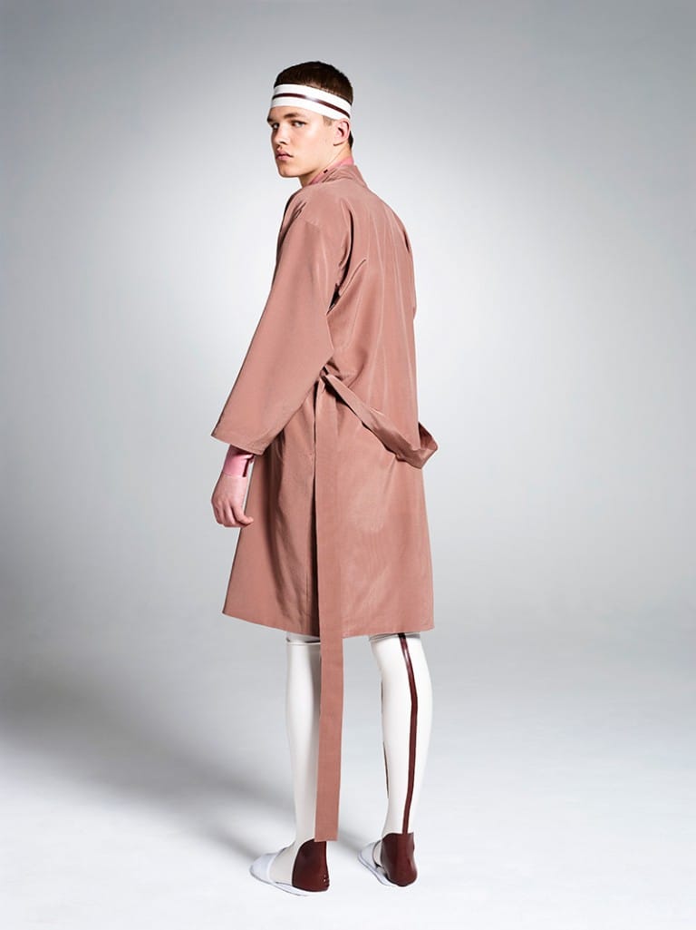 This is a collection of exaggerated proportions. It embodies the contrast between the cybernetic and the physical. Enlarged fits and volumes are either extremely oversized or very formfitting. Parka jackets and blousons are amplified to loose, expanded dimensions with dropped shoulders and baggy sleeves. Trousers are either shrunken or wide. Shorts linger somewhere in between hot pant and boxer.” – FY Magazine.es