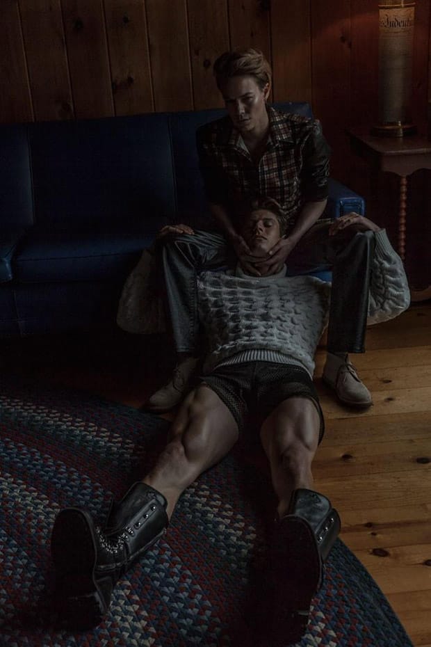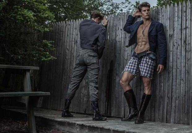 OUT Magazine enlists models Eian Scully and Elliott Sailors to star in Cabin Fever story captured for their latest edition by fashion photographer Harol Baez. In charge of styling were Charlie Ward & Lara Glassman, with beauty from makeup artist Michael Hanz and hairdresser Jared Riccardi.” – Malemodelscene.net