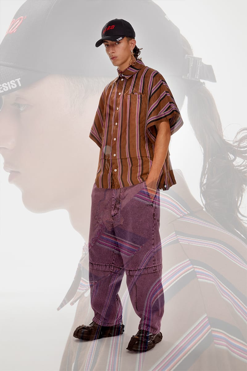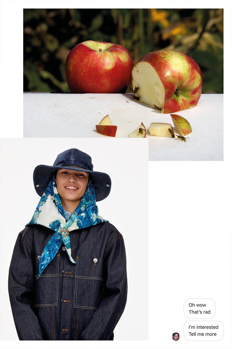 Entitled ‘Yes Future’, the collection by Aurélien Arbet, Jérémie Egry, and José Lamali is an optimistic deep dive – a challenge to negativity and an interrogation of the tropes of American menswear from the desert and the mountains to the sea. Ethridge’s iconography is salient – from the iconic Pigeon (2001) to newer works like Apple Bees and Rockaways (Dawn Patrol) depicting cut fruit, sunrises, and surf breaks – and their placement not only frames Ethridge’s work as subplots but employs his practice of layout, furthering the dialogue of his images over button-down shirts, jersey hoodies, and oversized tees.