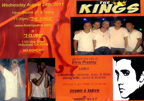 Come Join us for “THE KINGS” performing the hits of Elvis Presley @ “3 Clubs” on Wednesday August 24, 2011 @ 11:30pm!!!