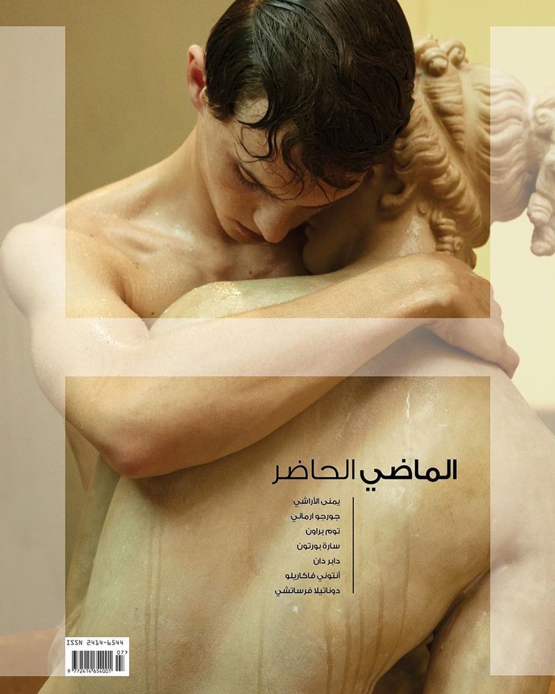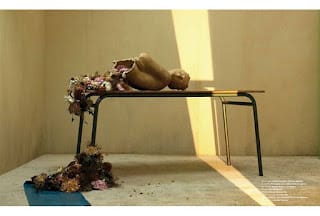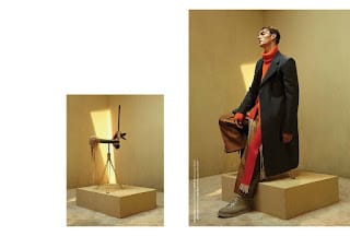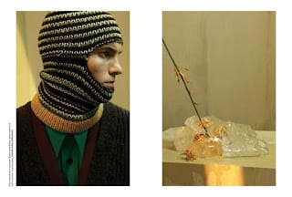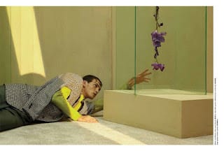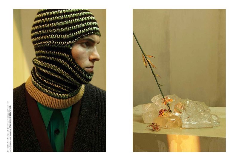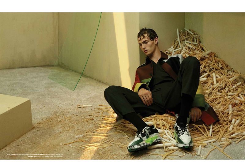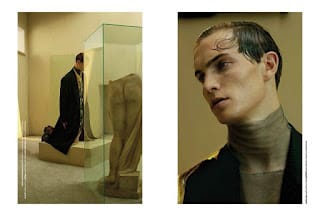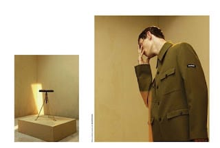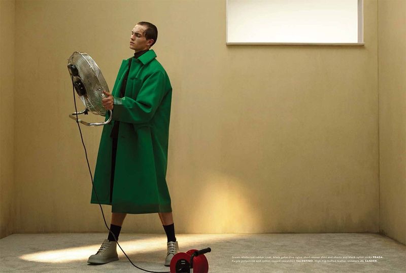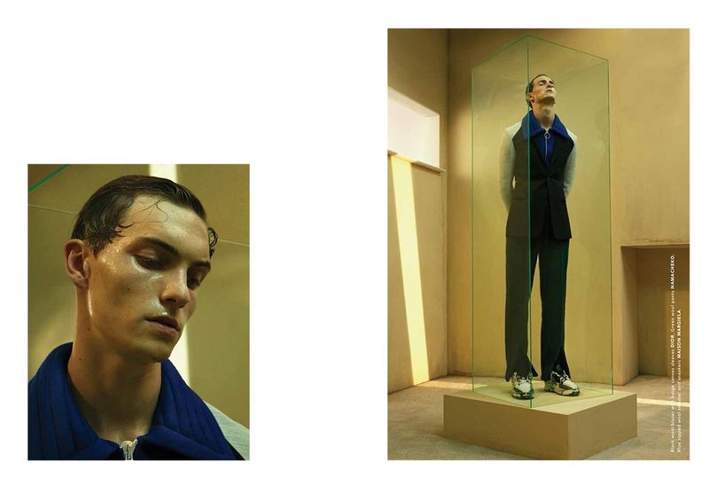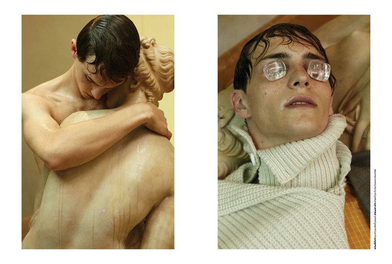 “Luc Defont-Saviard goes artsy for a cover story for H magazine. Katja Mayer photographs the leading model with styling by Emil Rebek. Appearing in an editorial entitled “Extinction,” Luc is simply captivating. Embracing fashion-forward silhouettes, Luc dons a variety of brands. Rebek outfits Luc in labels such as Prada, Valentino, and Balenciaga.” – TheFashionisto.com