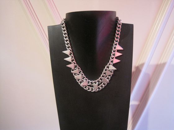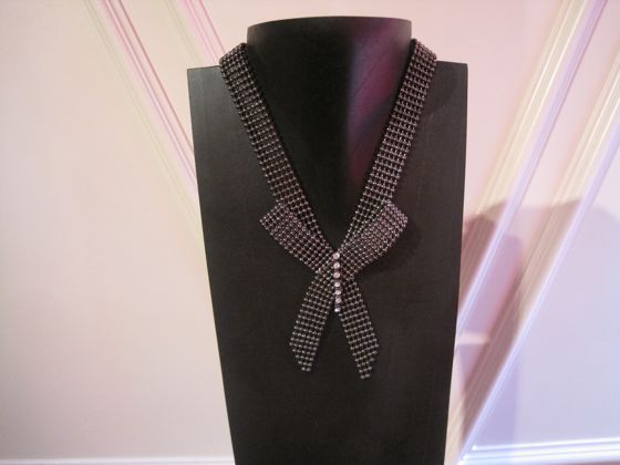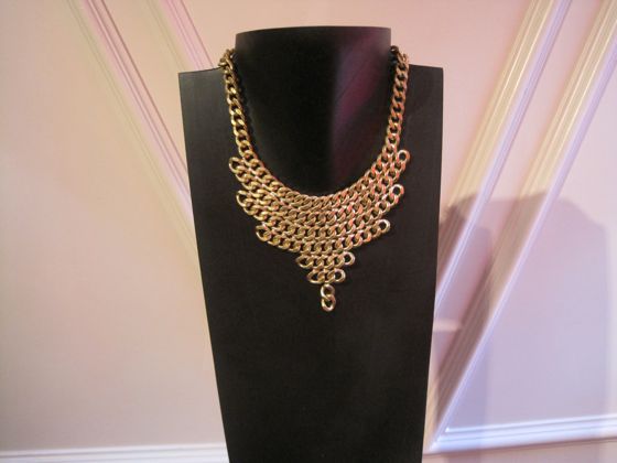 They’ve described the collection pieces as, “Her signature touches and familiar DNA are still there, but tweaked. Chunky base metal chains are wrapped and stacked, sometimes mixed with Swarovski crystals. We loved a simple white metal three-chain sculptured necklace. The crystal pieces are unusual. Crystals have been made to look like semiprecious stones. Mint alabaster crystals, in a milky shade of jade mix beautifully with opal and ruby-esque crystals.”