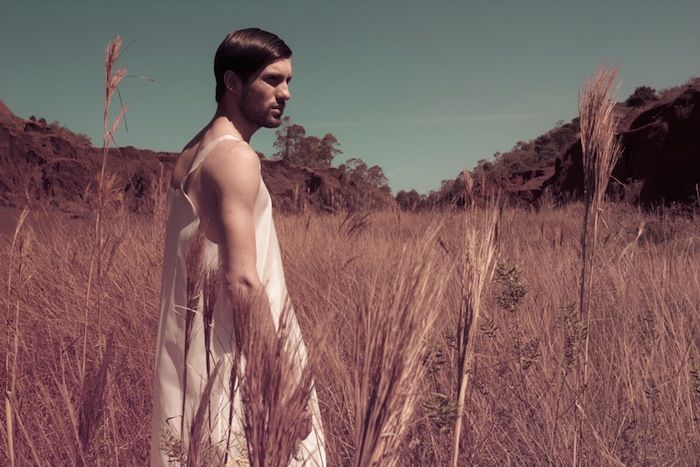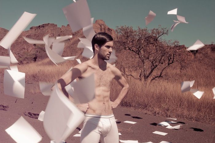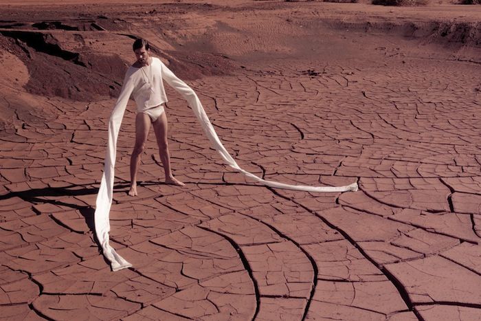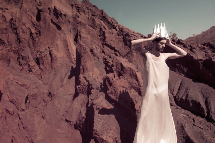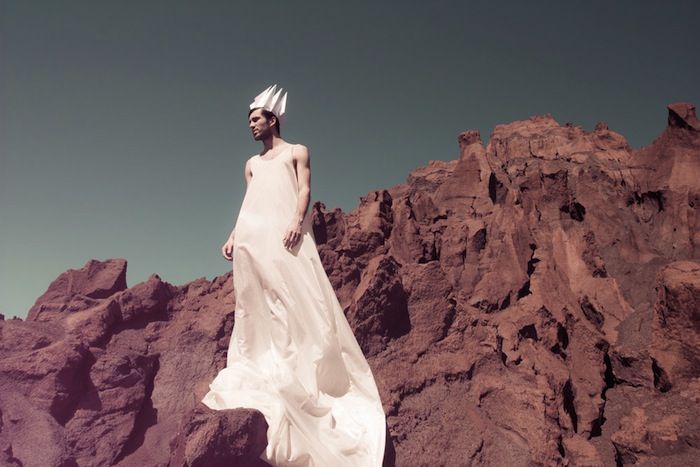 Majestic Paper–Fernando Machado is photographed by Rafa Borges in a new all white editorial. Shot against the clay back drop of the desert in Brazil, the solitary figure cuts a royal figure, donning crowns and neckpieces composed of paper. Courtesy of – thefashionisto.com
