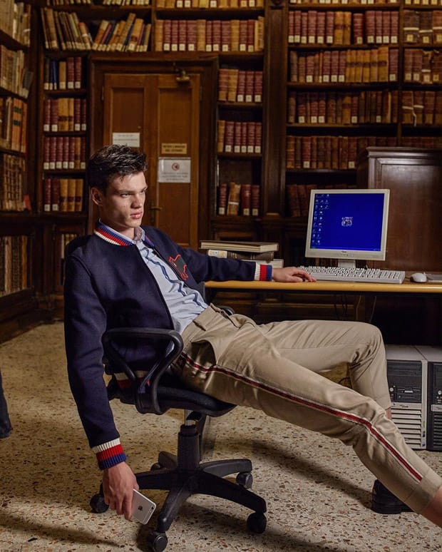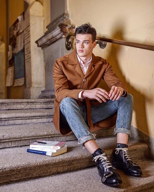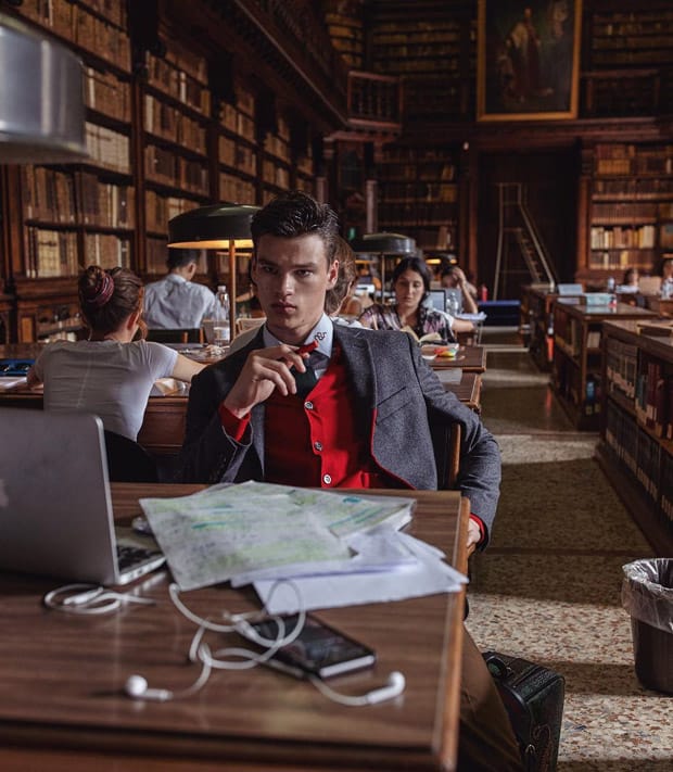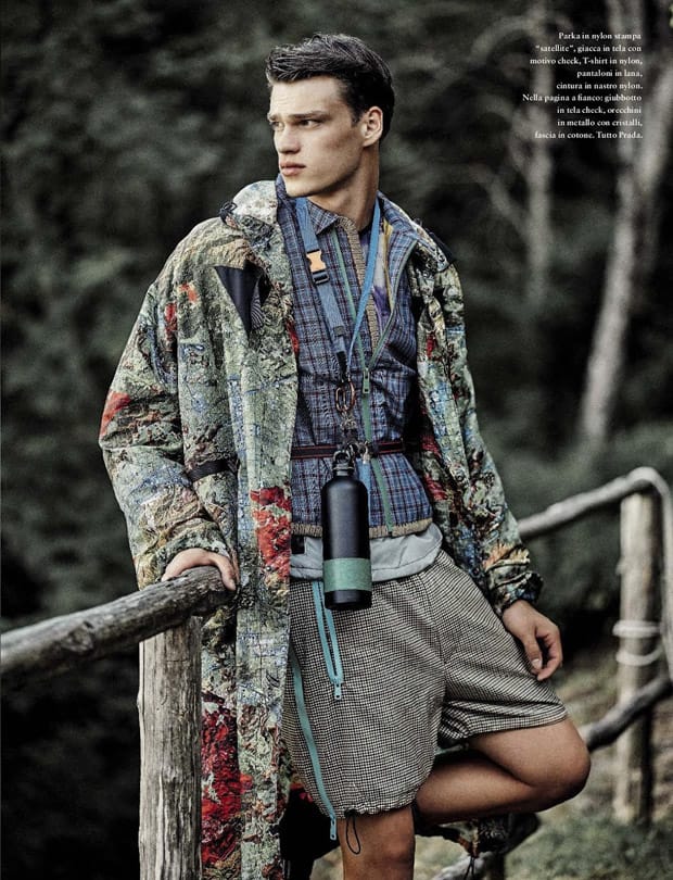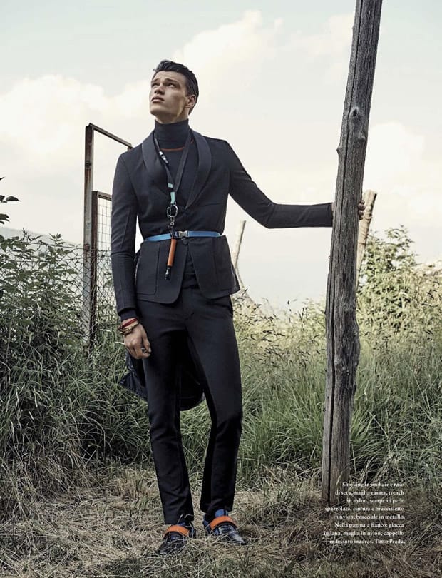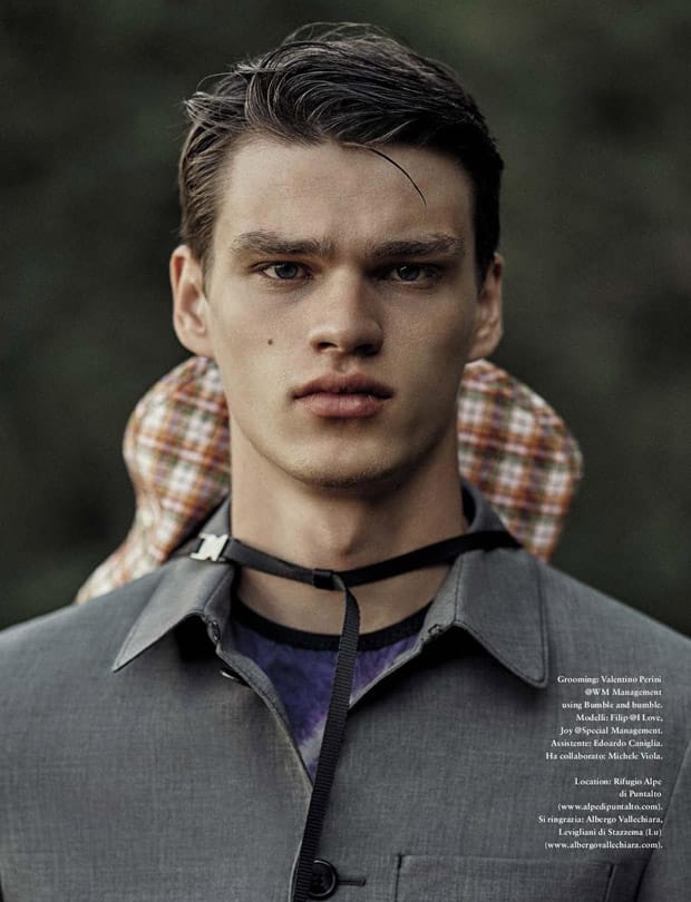 “Top model Filip Hrivnak teams up with fashion photographer Tim Clark for The Searchers story coming from the pages of GQ Italia’s December 2016 edition. Grooming is work of beauty artist Valentino Perini at WM Management. For the session Filip is wearing selected looks from Prada.” – Malemodelscene.net
