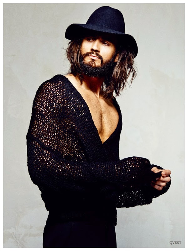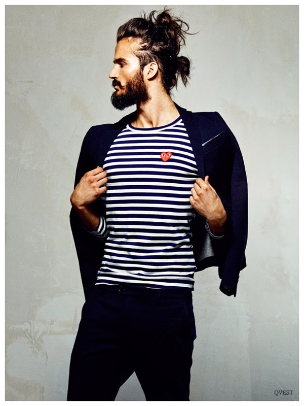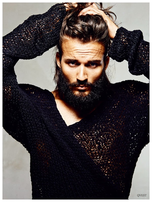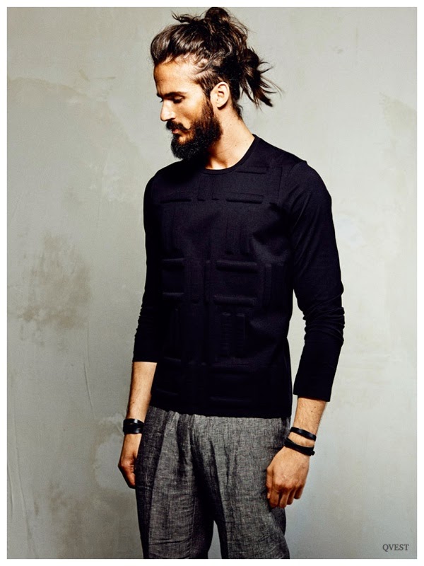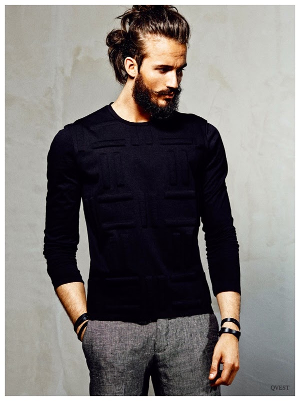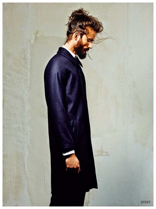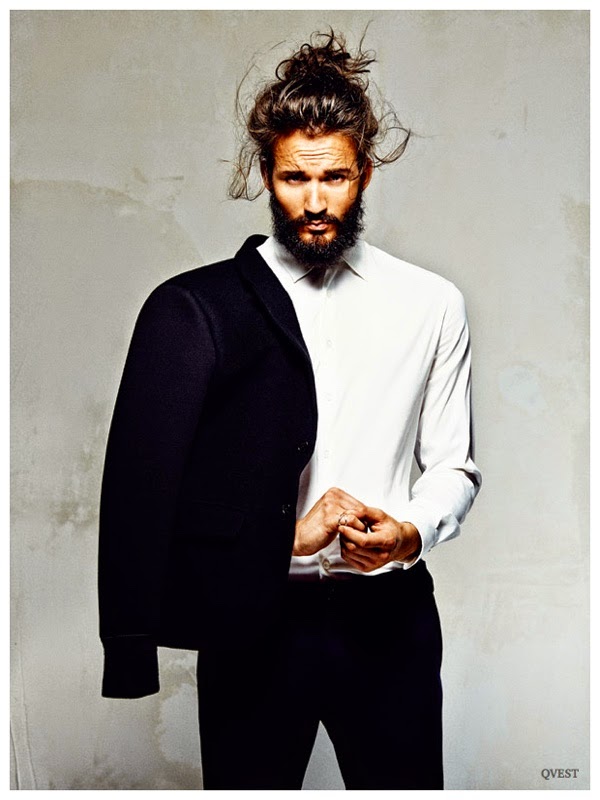 “Appearing in the latest issue of QVEST, model Finn Brock is photographed by Patrick Styrnol for one seriously chic story. Hitting the studio with stylist Jennifer Kalaitzis (Management of Style), Finn dons a sleek wardrobe, which consists of pieces from Prada, Hien Le, Weekday, Trussardi 1911 and more. Groomed by Mel Goldmann (Nina Klein), Finn gets his long hair pulled back into a series of sophisticated and Bohemian updates, making for quite the hair inspiration.” – The Fashionisto