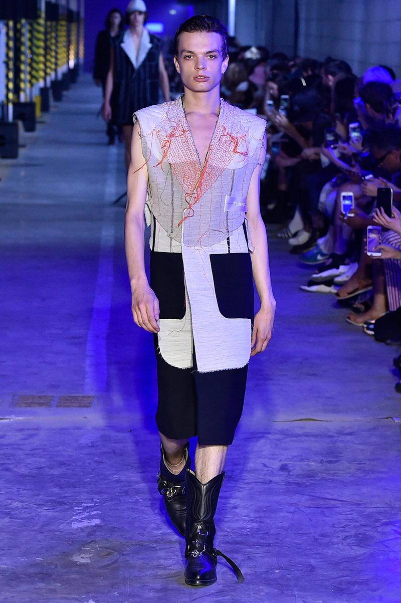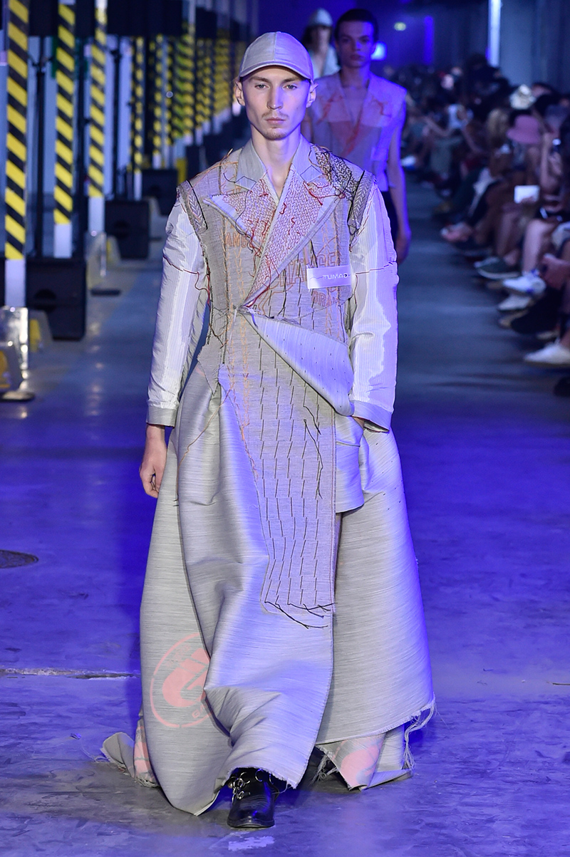“While the first collection aimed to lay down the foundation of a shared vocabulary, the second GAMUT‘s collection is a free continuation of this collective work with a nod to the traditional codes of clothing and accessories. GAMUT pursues its mix of genres by taking over old-fashioned couture codes, opening unexpected windows on the body and developing an open and unisex wardrobe. The chosen techniques and finishes focus on ultra-artisanal suits and technical pieces designed in an industrial manner.” – FY Magazine.es