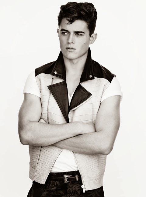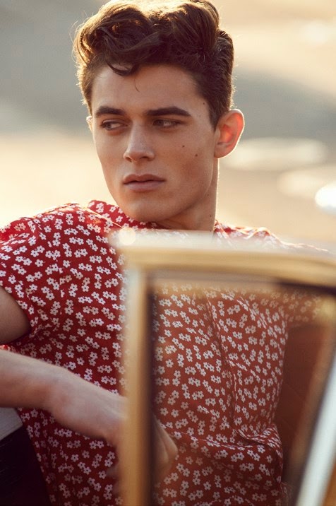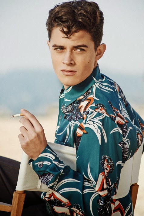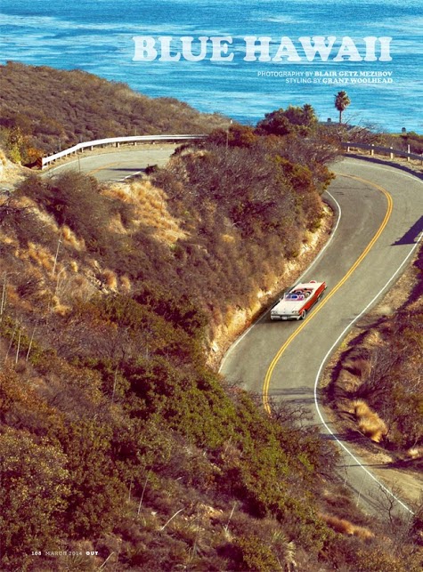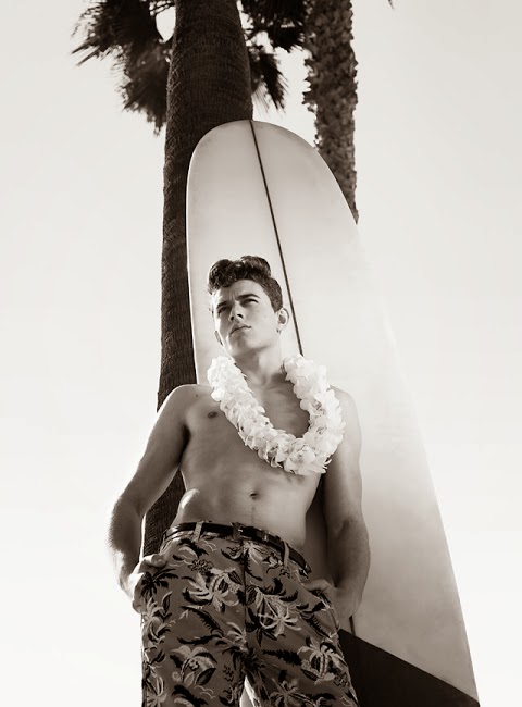British model George Elliott at DNA is photographed by Blair Getz Mezibov and styled by Grant Woolhead in the story ‘Blue Hawaii’ for OUT magazine. Courtesy of – Homotography